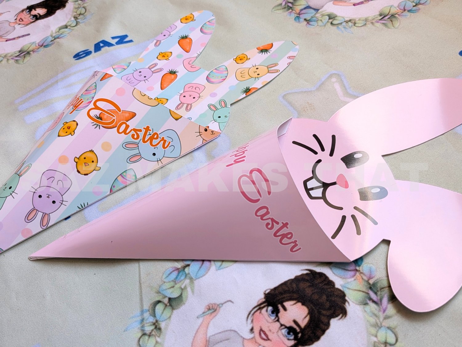 the file includes 2 different bunny cones that can be personalise with images and text for print then cut or just cut from plain or patterned card.