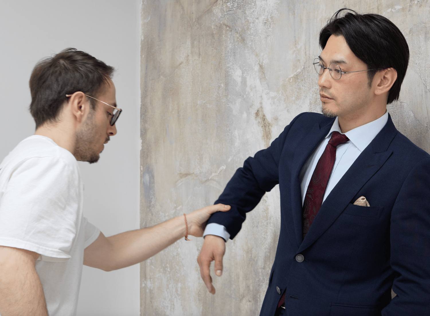 M.T is wearing a fashionable suit during a photo shooting. Every time I take a photo of him with the smartphone he has to freeze in place. He is then moved like a nice mannequin.
