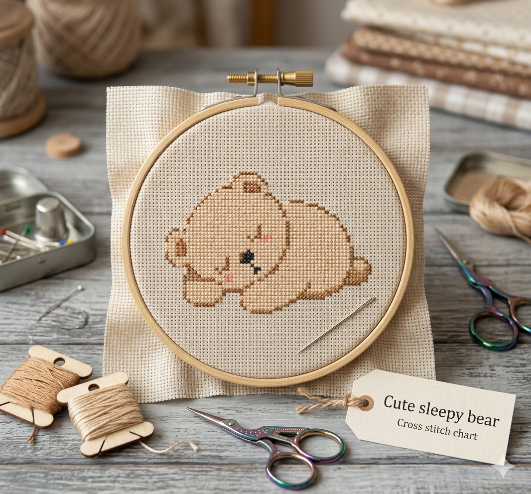This adorable cross stitch pattern features a cute sleepy bear with a soft, peaceful expression. Simple shapes and a smaller stitch count make this a relaxing, beginner-friendly project perfect for cozy stitching sessions.