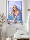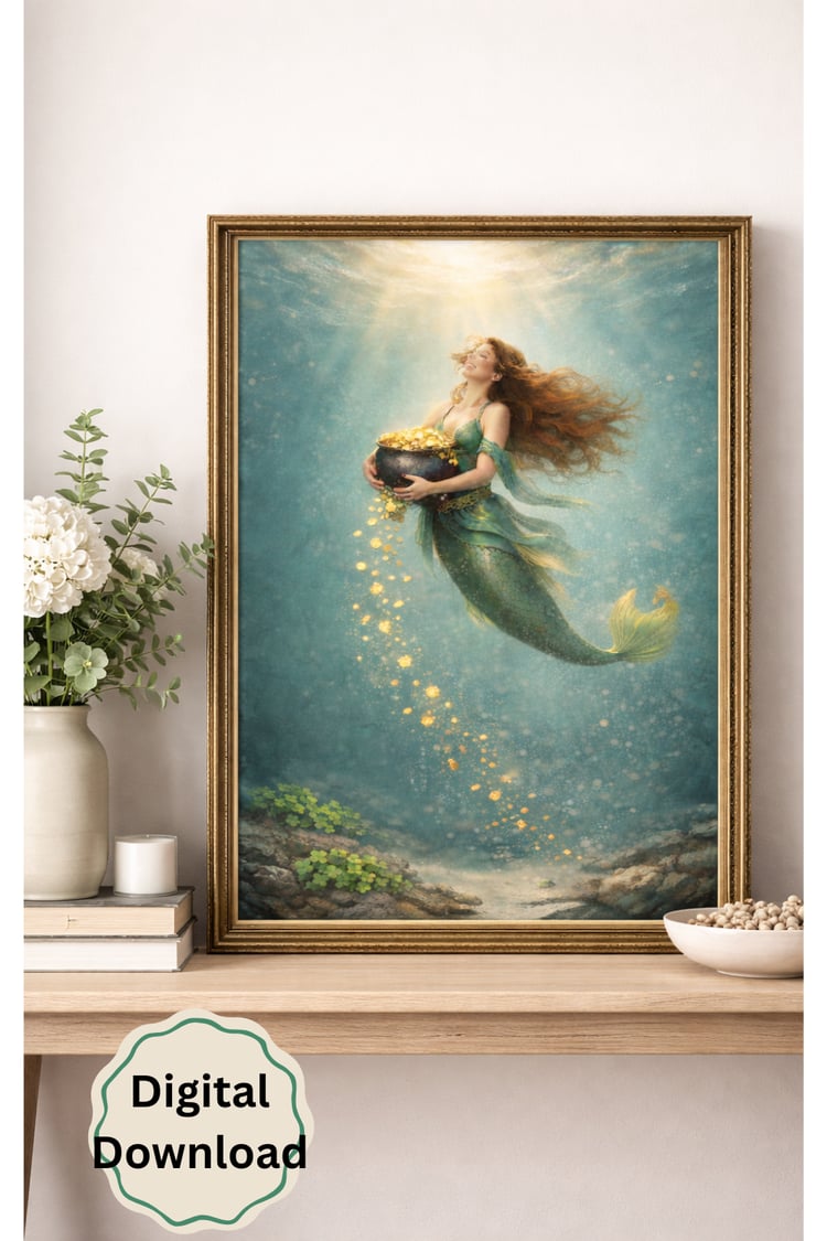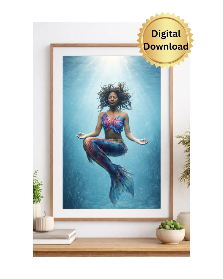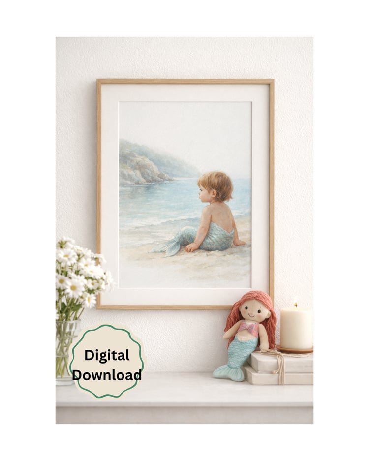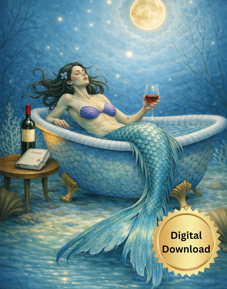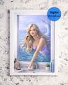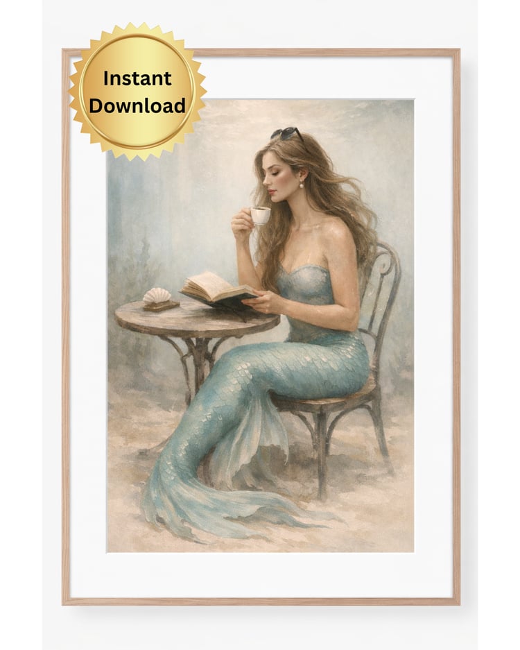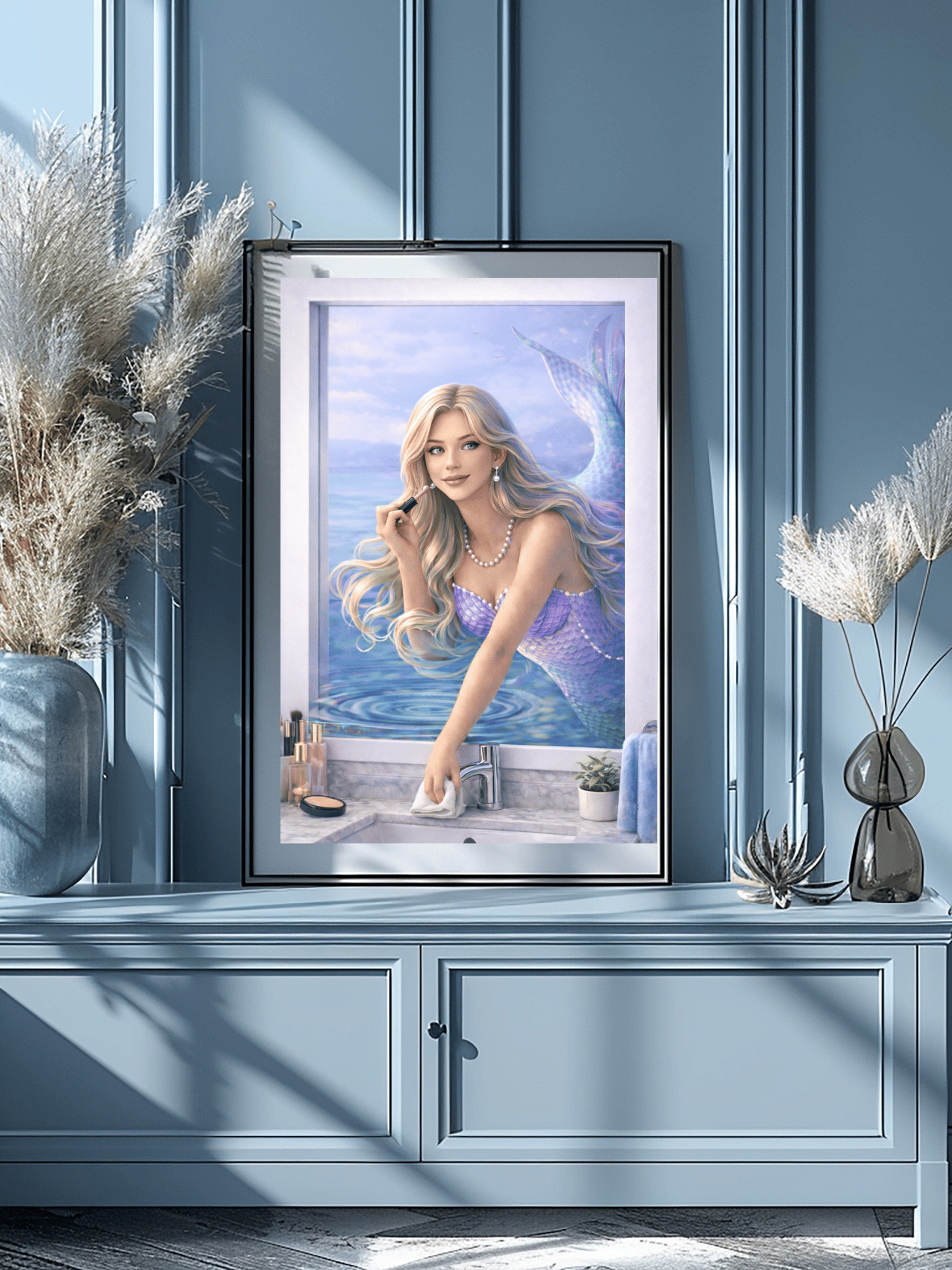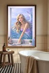 This whimsical portrait features a stunning blonde mermaid finishing her "morning touch-up" at a seaside vanity. Blending the magic of the ocean with the everyday setting of a bathroom, this piece is a perfect conversation starter for a coastal home, guest bath, or a fantasy-inspired gallery wall.