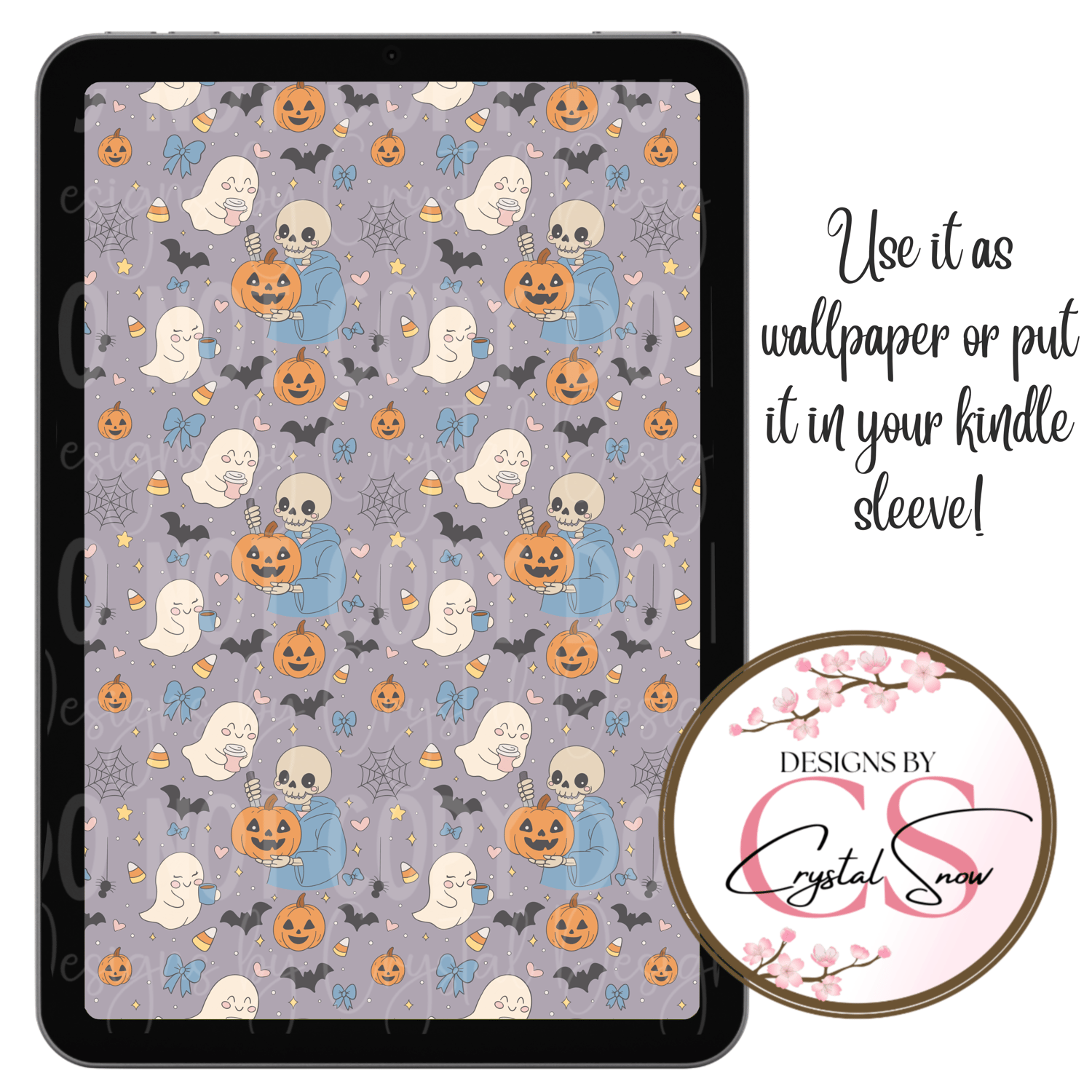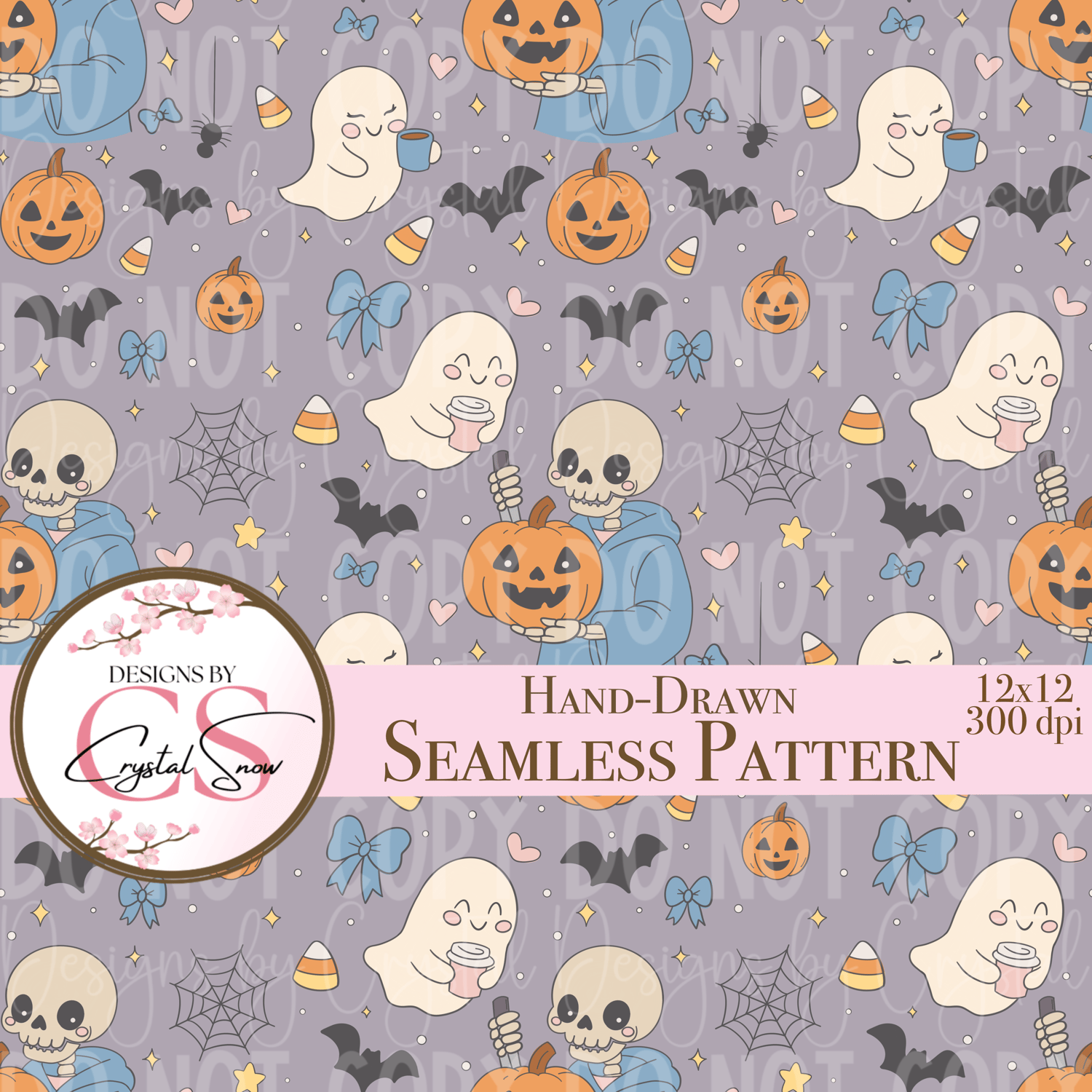 This hand-drawn seamless pattern blends cozy Halloween charm with soft gothic style. Featuring playful ghosts, pumpkins, skulls, bats, spider webs, and candy corn, this design is ideal for creating unique seasonal projects.