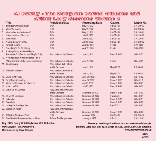 Here is the second volume of Carroll Gibbons and Arthur Lally's bands featuring Al Bowlly on vocals. There are a number of rare sides here.