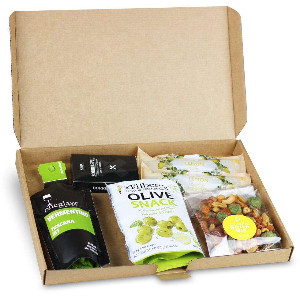 Stuur een borrel als cadeau, met dit originele luxe brievenbuspakket! Laat je verrassen door de smaak van de heerlijke Ice Popsicle, dit zijn de bekende vrieslollies, maar dan in een modern jasje. De mooie Vermentino witte wijn, luxe borrelnoten mix en smaakvolle olijven maken dit pakket compleet. En dit pakket bevat nog een leuk extra: een borrelspel met 40 recepten en 60 vragen voor bij de heerlijke borrel.