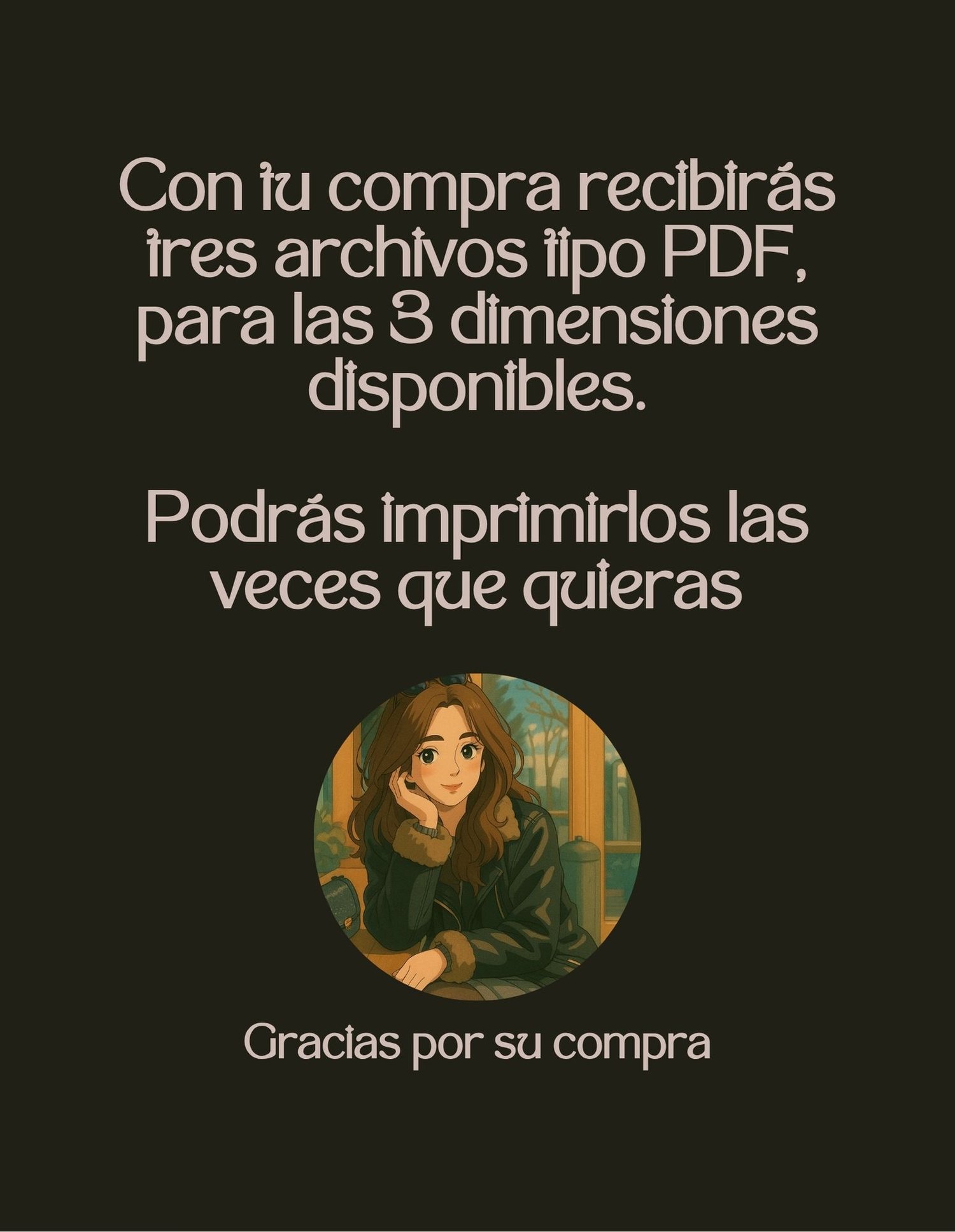 Al pagar recibirás tres archivos PDF de calidad, con 3 dimensiones: 16'x20', 18'x24' y 24'x36'. Puedes imprimir uno, dos o todos, como desees, ya sea para posters, lona o cualquier otro material, la calidad de imagen es excepcional.