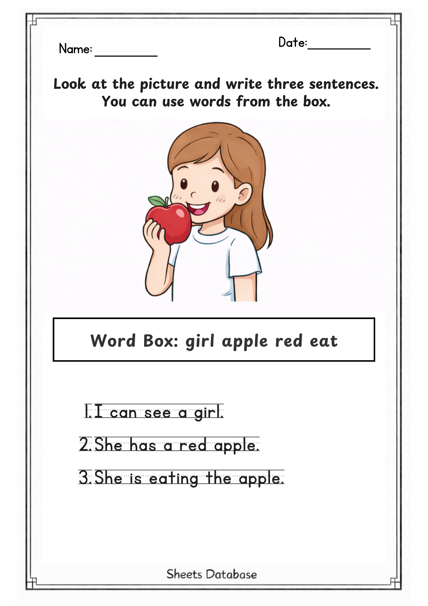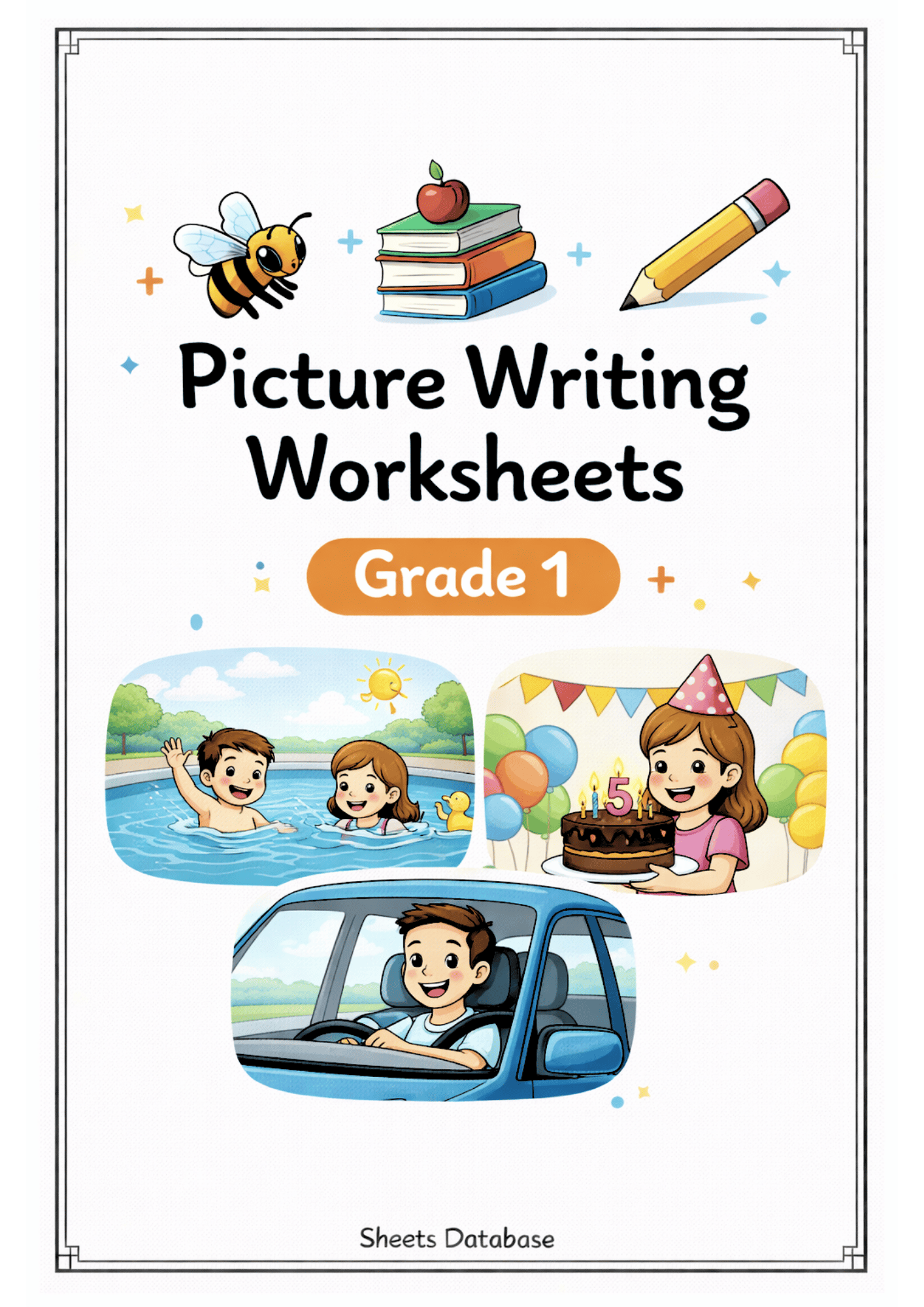 This worksheet pack is designed to help Grade 1 students practice writing short, clear sentences based on pictures. Each page includes a colorful image that encourages children to observe carefully and write meaningful sentences.