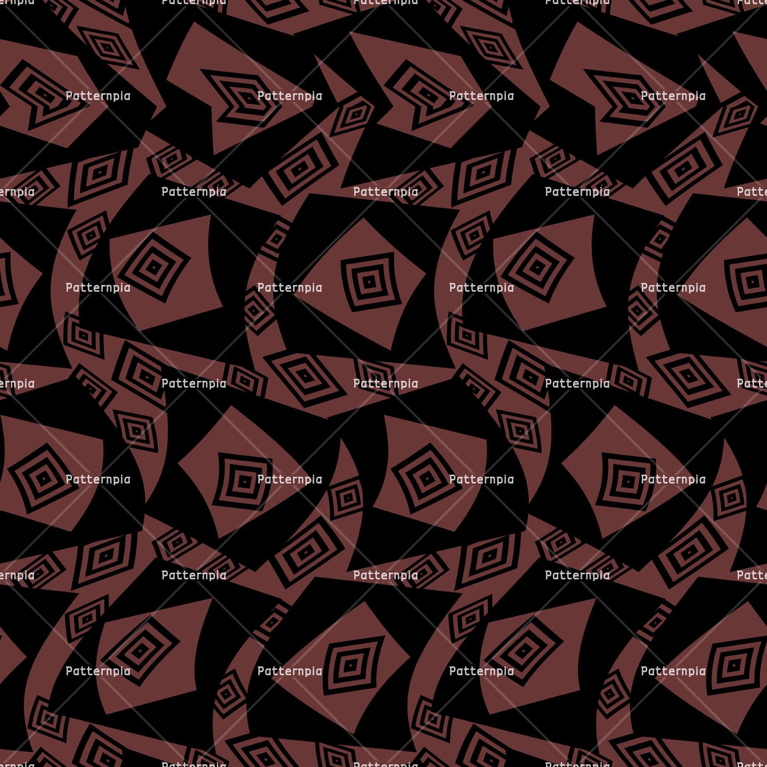 Dark brown diamonds with nested black outlines interlaced by curved bands of smaller motifs on black base