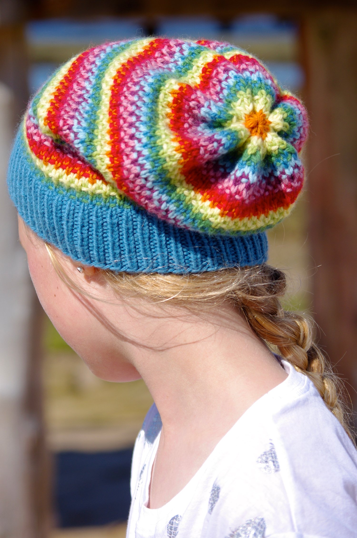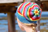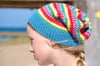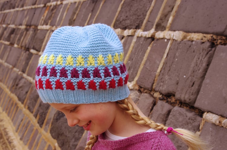 Brimpaen is worked seamlessly in the round from the ribbed brim upwards. The body of the beanie can be worked in as few as one colour and as many as the knitter wishes, with slipped stitches used to create the stitch pattern. The sample uses ten. The crown is decreased dramatically to create a ruched effect.