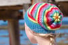 Sample knit in WOOLganic Raindrops, Gondwana, Kyoto, Samsara, Sangha, Chilli, Blossom, Lotus, Kundalini and Krishna — ten colours; Number of colours isn’t crucial can be knit with any number of colours. Sample size is size 22”.