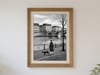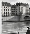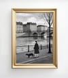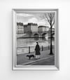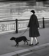 Monochrome urban landscape art of a woman and dog by the river in Paris uk051