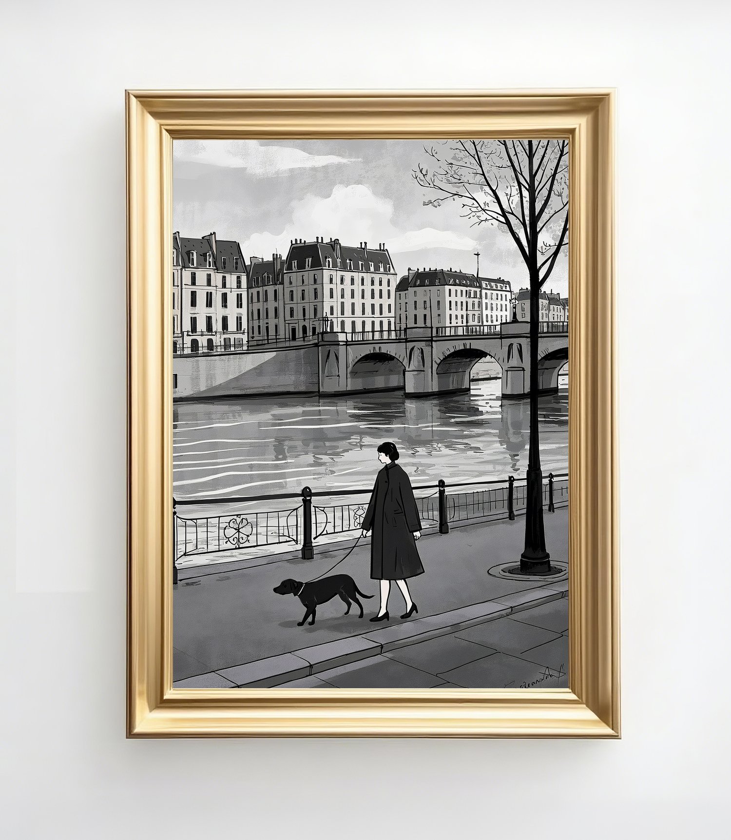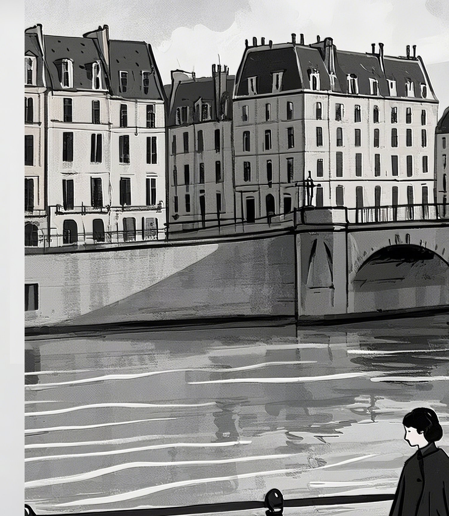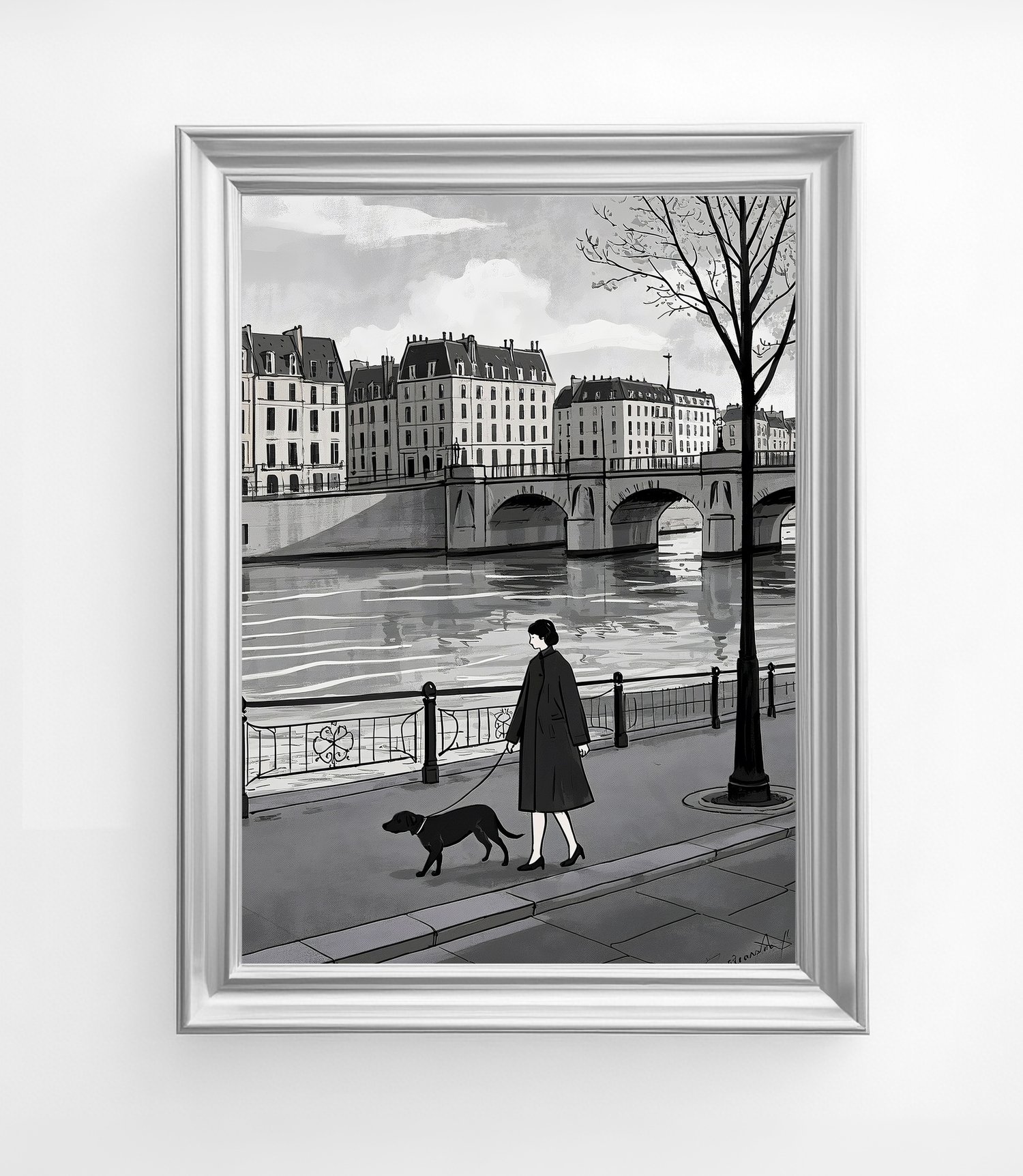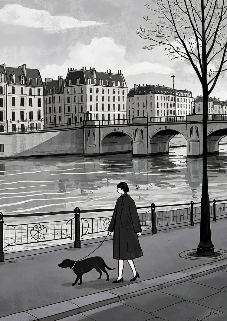 This artwork presents a refined impression as a monochromatic urban landscape. The scene of a woman walking her dog along the Seine captures a poetic moment of everyday life, inviting viewers to imagine their own stories. The depiction of the bridge and buildings is simple yet balanced, effectively conveying depth and the unique atmosphere of a European city. Within the grayscale palette, the calm presence of the woman and the loyal dog adds a subtle warmth, softening the stillness of the scene. Overall, it is a sophisticated piece that beautifully conveys the quiet poetry of city life.