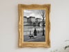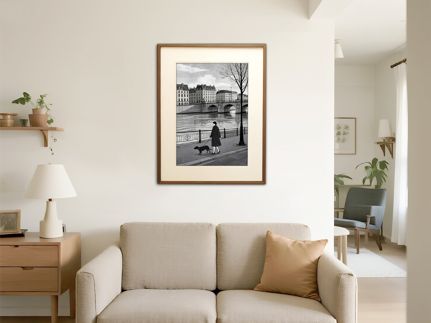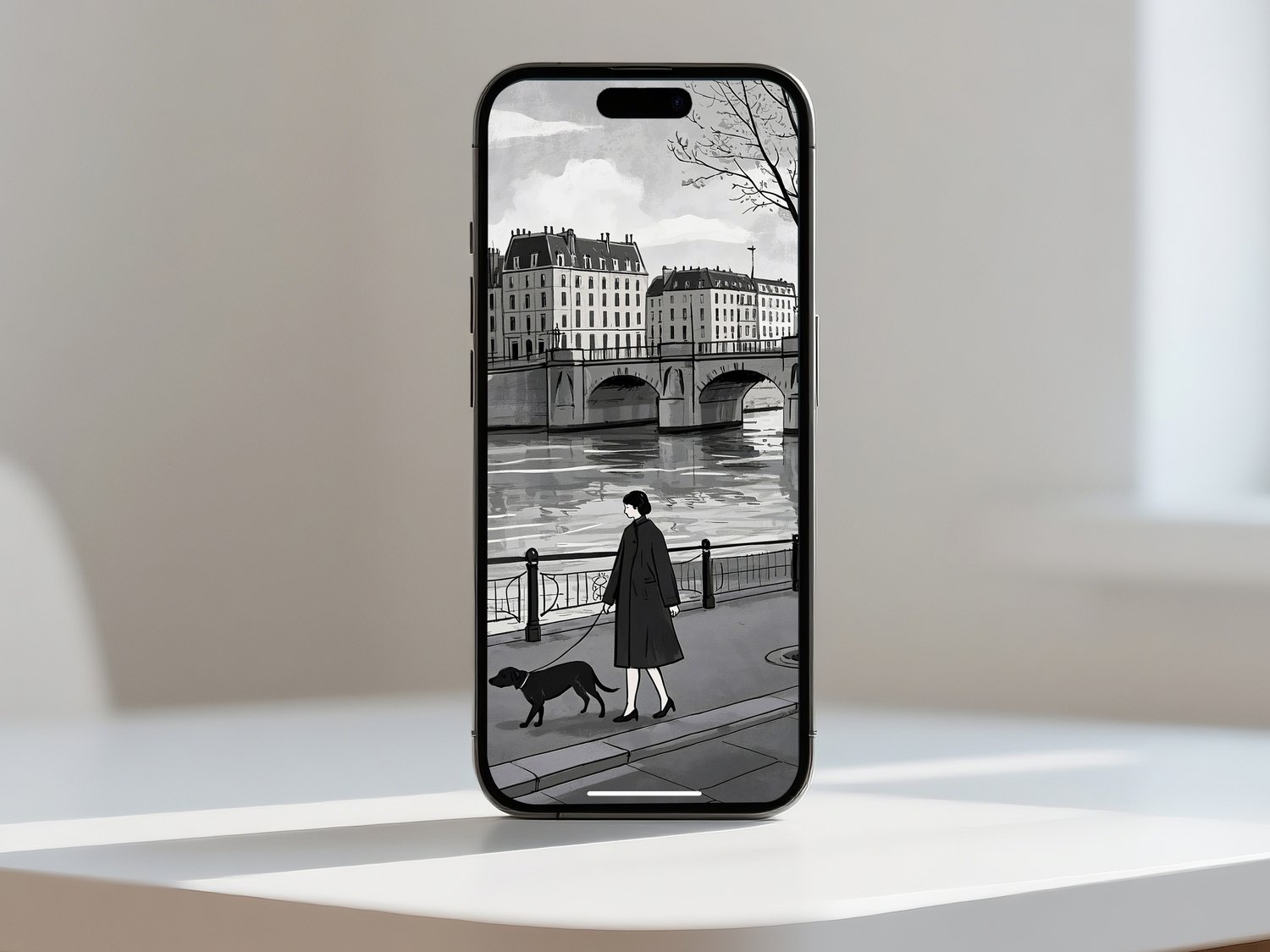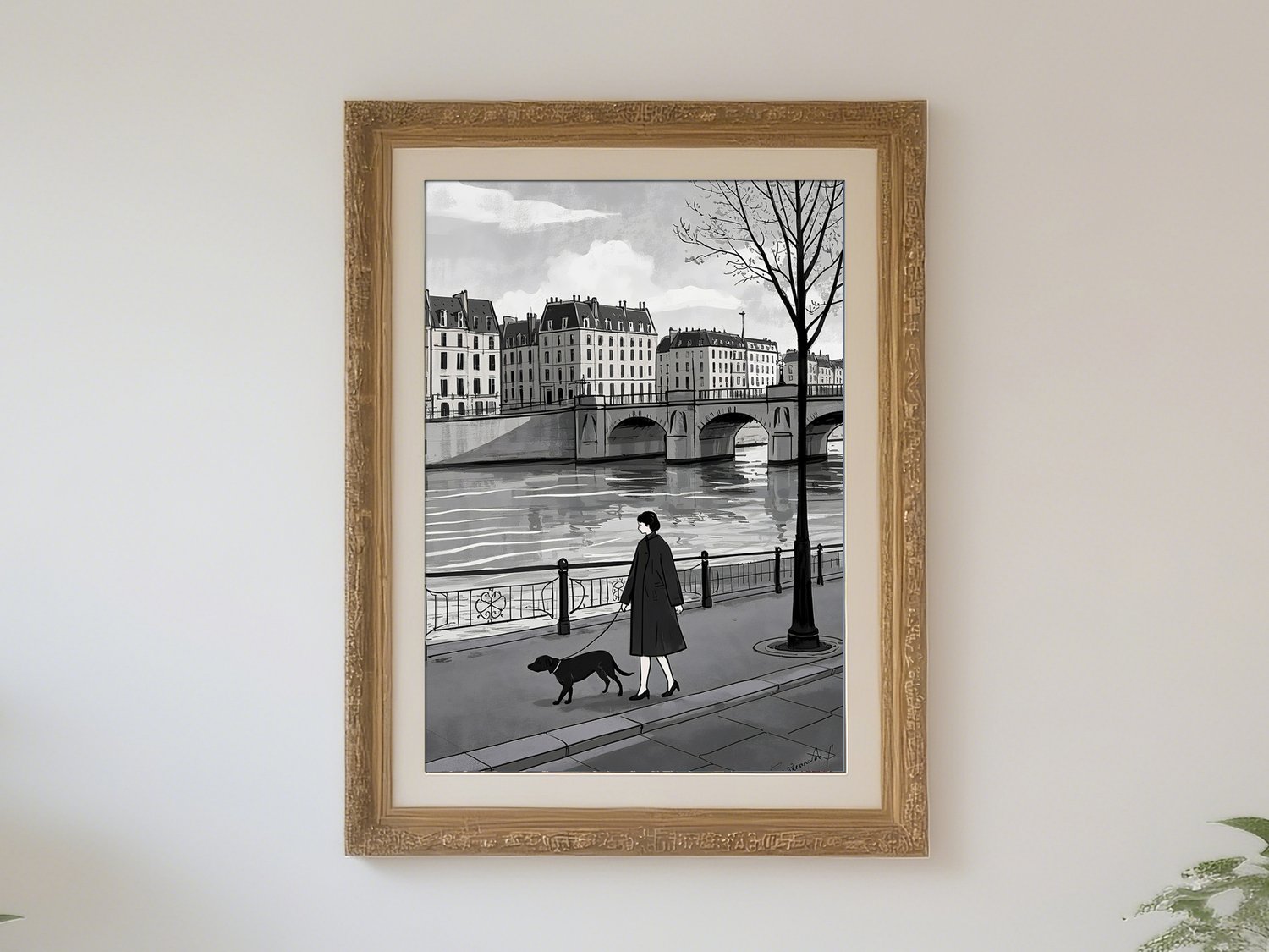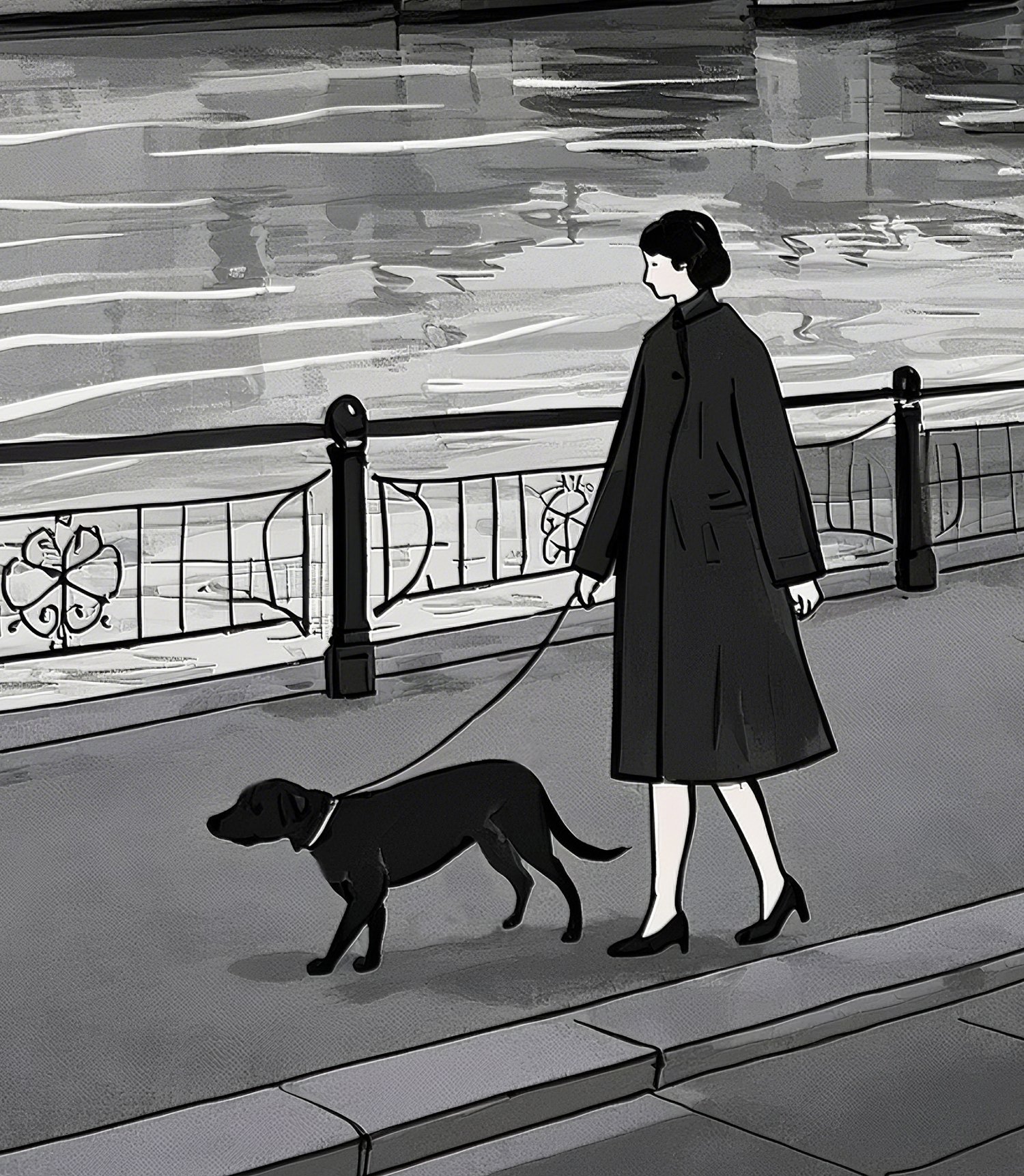 This artwork presents a refined impression as a monochromatic urban landscape. The scene of a woman walking her dog along the Seine captures a poetic moment of everyday life, inviting viewers to imagine their own stories. The depiction of the bridge and buildings is simple yet balanced, effectively conveying depth and the unique atmosphere of a European city. Within the grayscale palette, the calm presence of the woman and the loyal dog adds a subtle warmth, softening the stillness of the scene. Overall, it is a sophisticated piece that beautifully conveys the quiet poetry of city life.
