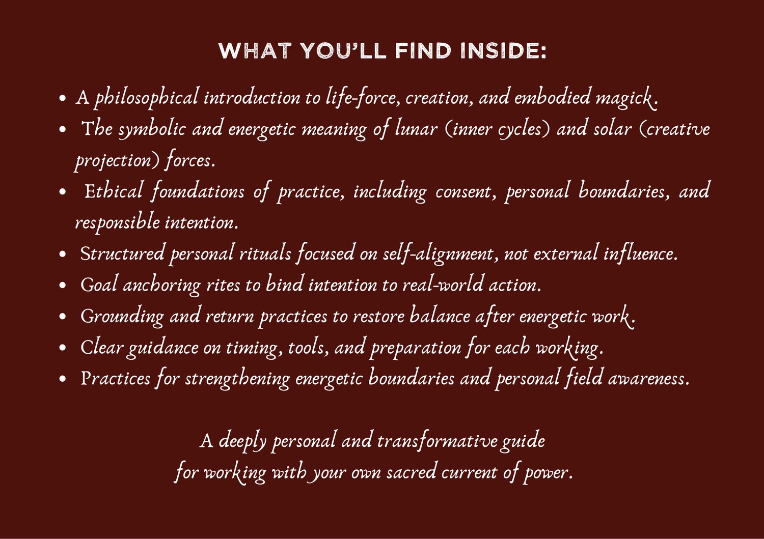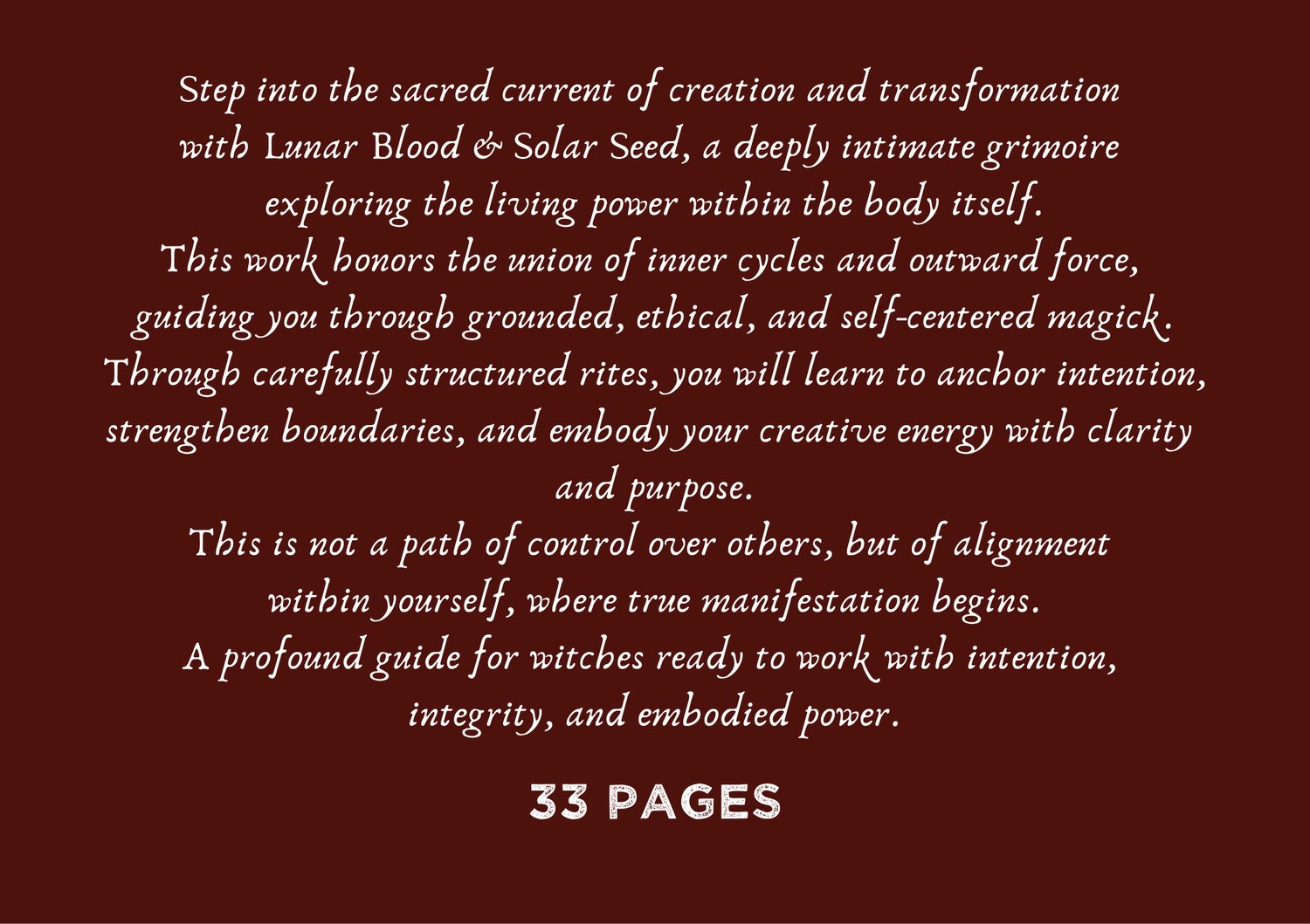 This work honors the union of inner cycles and outward force, guiding you through grounded, ethical, and self-centered magick.