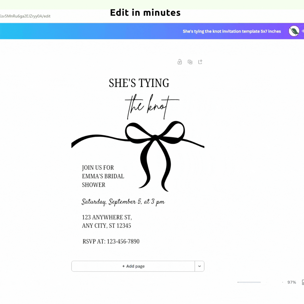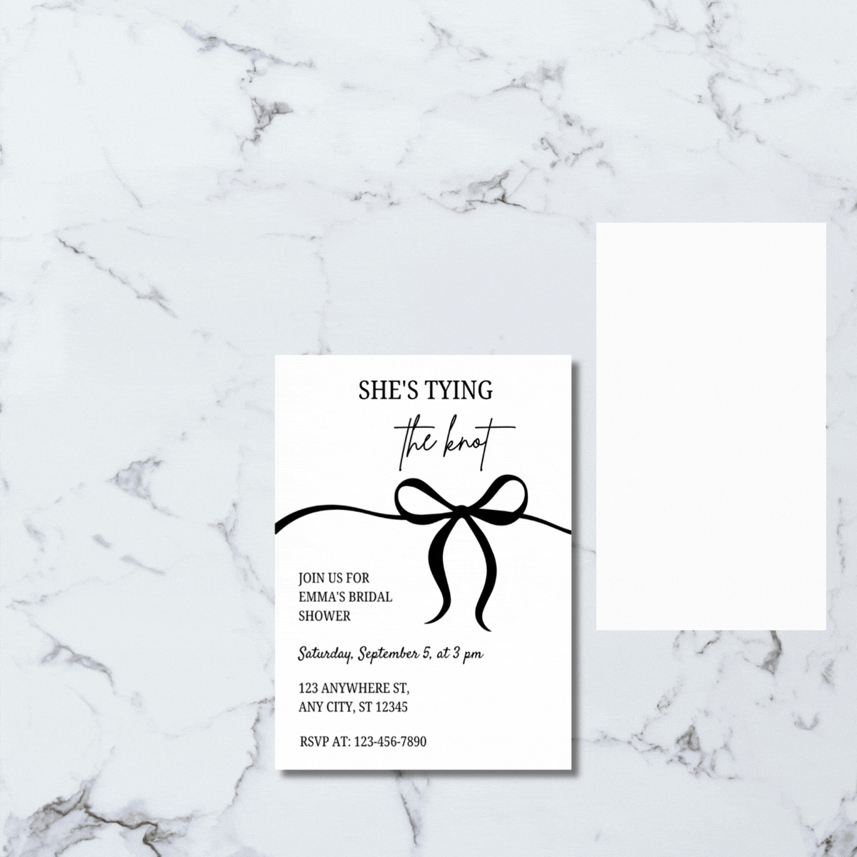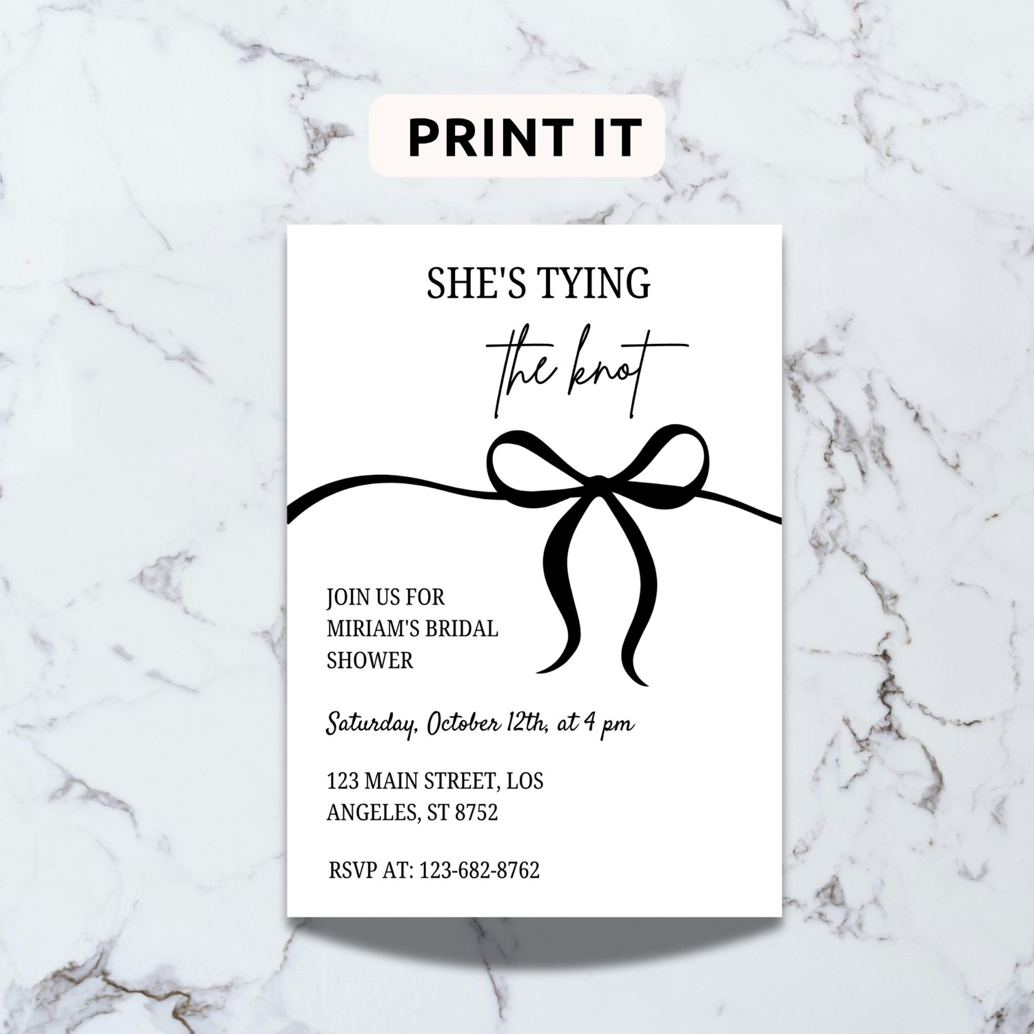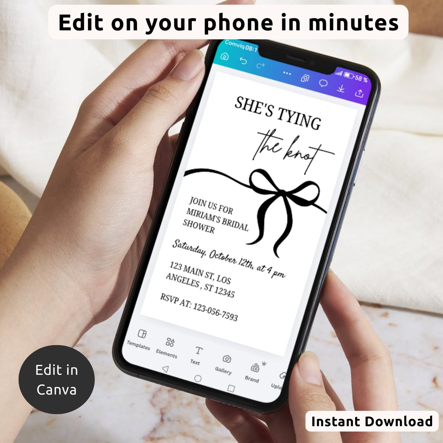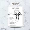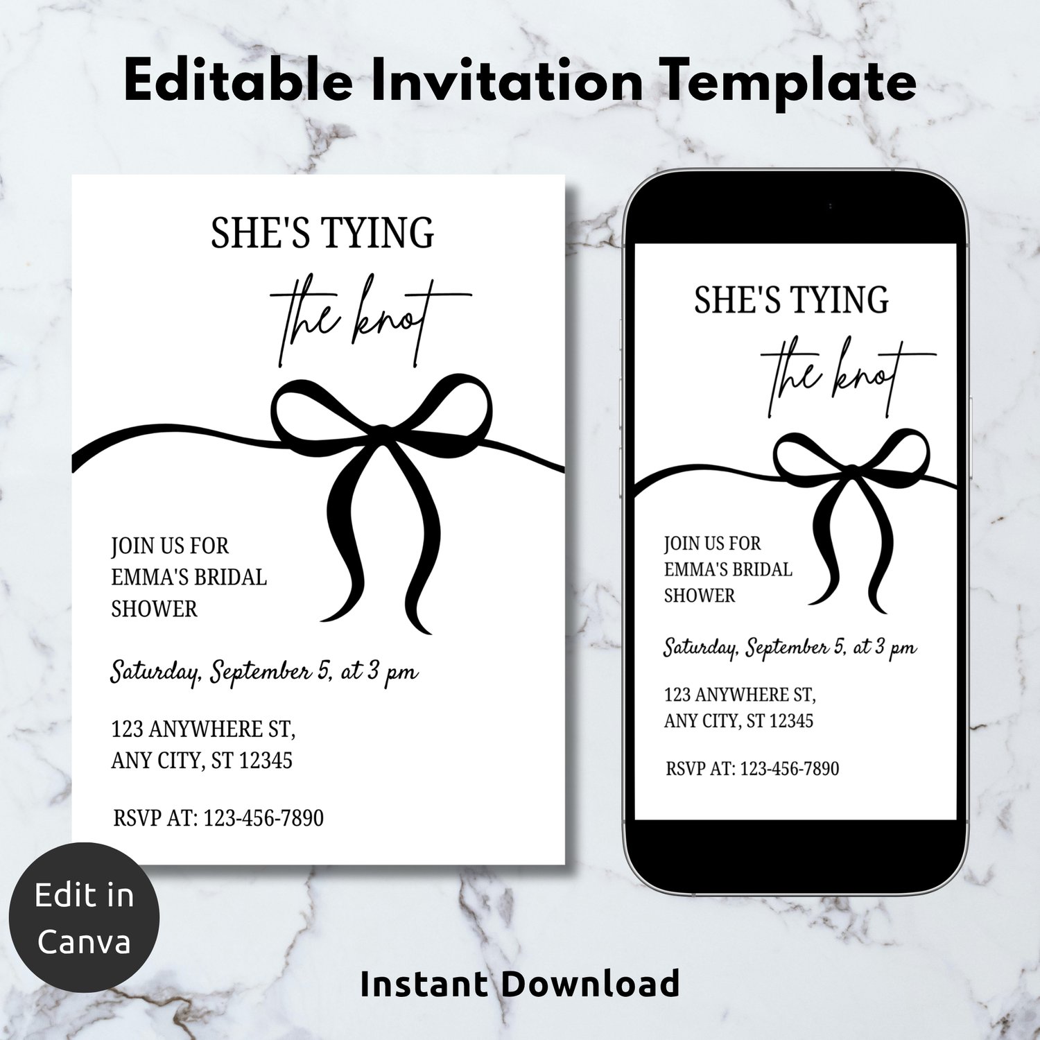Bridal Shower Invitation Template | She’s Tying the Knot Black Bow Evite | Editable Bachelorette Party Invite | Canva Printable or Digital Download