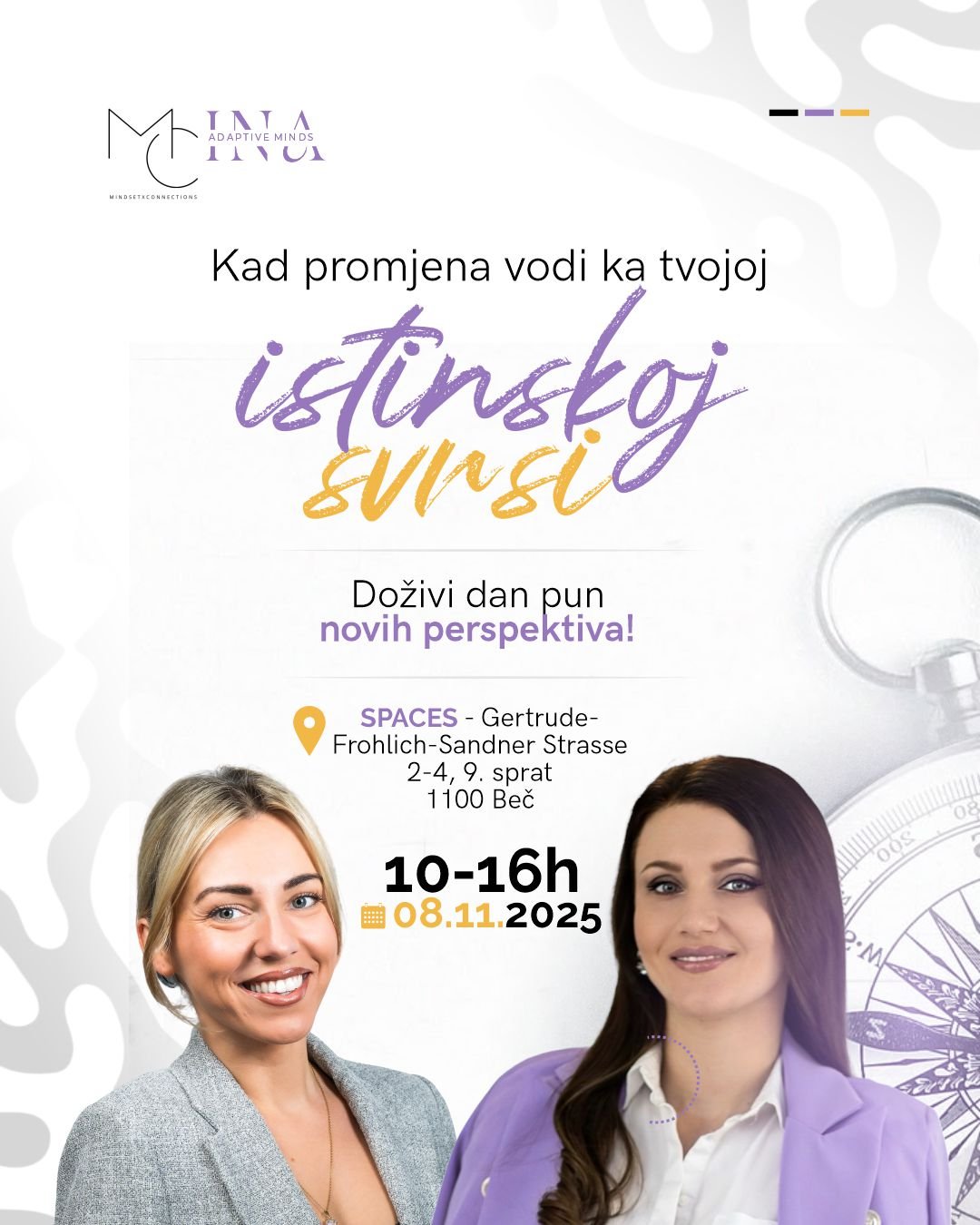 Mindset Connections & Adaptive Minds te pozivaju na intenzivnu radionicu ispunjenu novim perspektivama, dubljim razumijevanjem i alatima koji ti pomažu da posmatraš životne promjene drugačije i konačno živiš svoju svrhu.