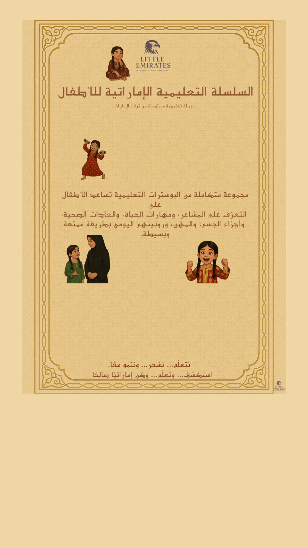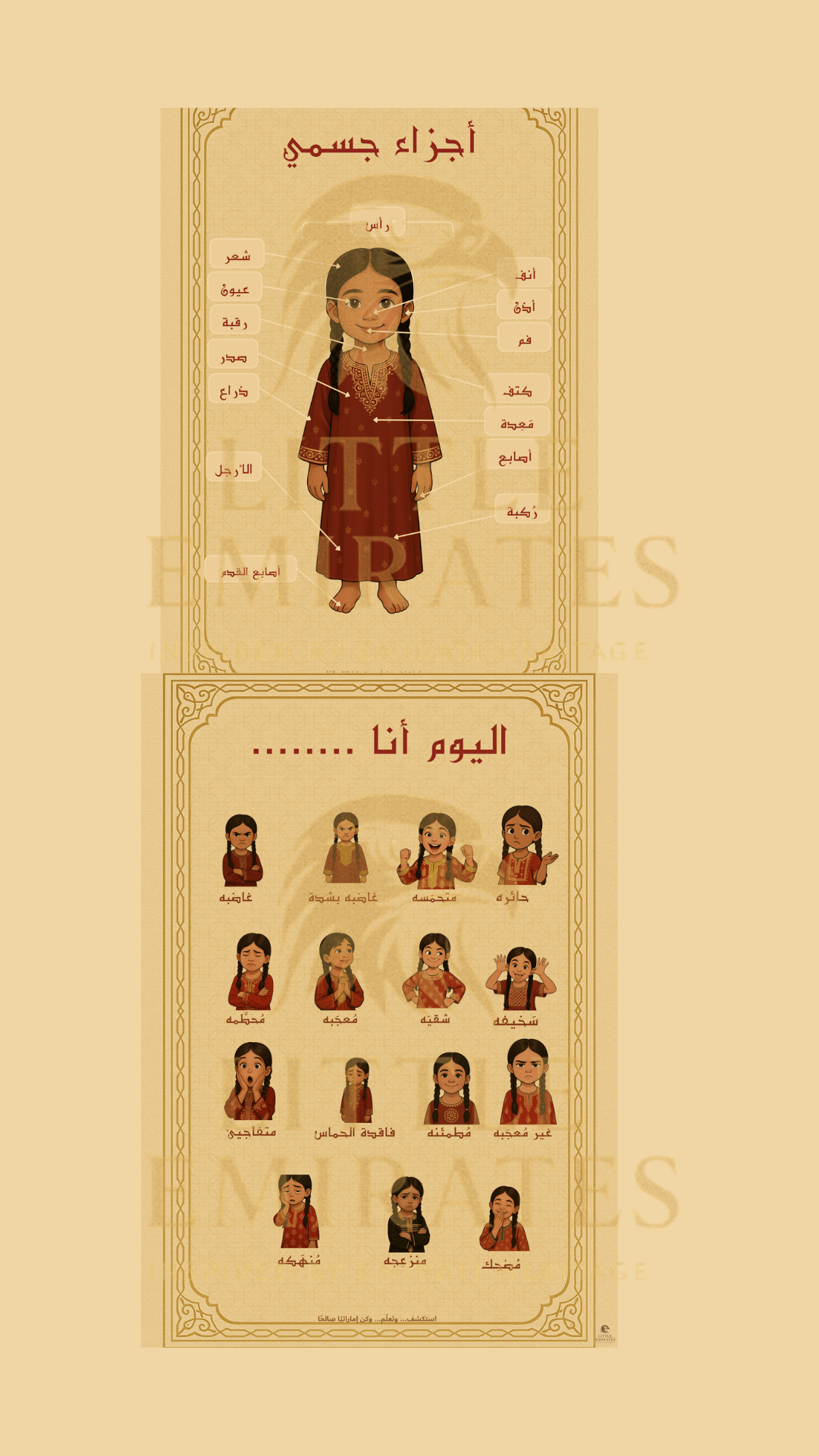 بوسترات تعليمية عربية مستوحاة من تراث الإمارات، تساعد الأطفال على التعرّف على المهن، المشاعر، العادات الصحية، أجزاء الجسم، ومهارات الحياة اليومية…