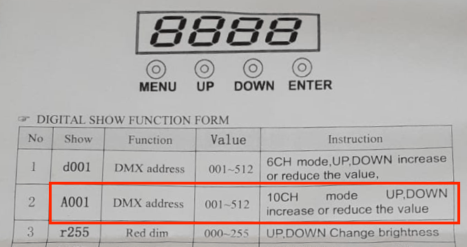 * Verifique que su Fixture sea de 10CH y que coincidan estos canales: 1 Dimmer, 7 UV, 8 Strobo.