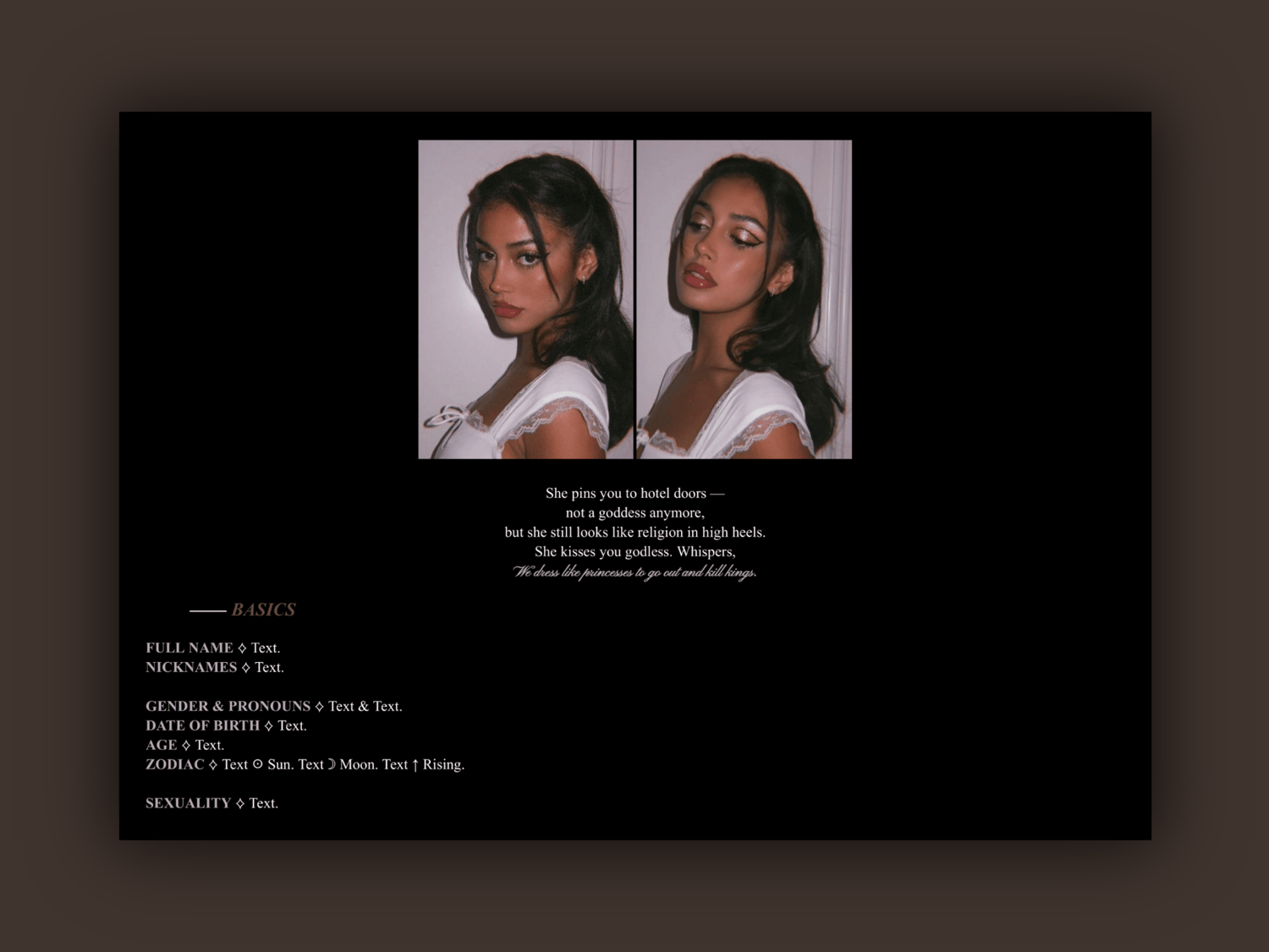 A companion document to Lilac Entanglements, now you have an endless-scrolling Google Doc template designed for your single muse's detailed information. This way you never have to worry about breaking formatting, no matter how much or little you write! Very few photos come with it, but that also means you can add as many as you'd like!