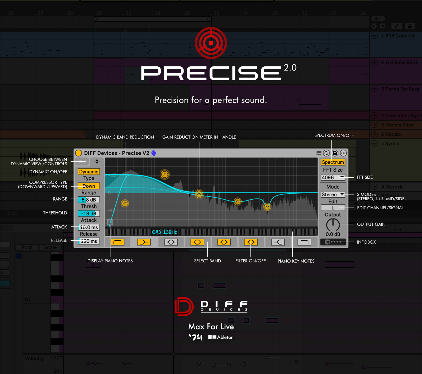 BLEND is a MaxForLive device that creates the “Sidechain” effect. Sidechain compression is used to rhythmically change the volume of audio channels to provide space and definition. As you may know in Electronic music, kick & bass needs to fit well together. This will be perfect to do that. But it can be used in other genres of music as well because it’s built with two modes: “Internal Sync” and with an “Input signal”. No more pops/clicks.