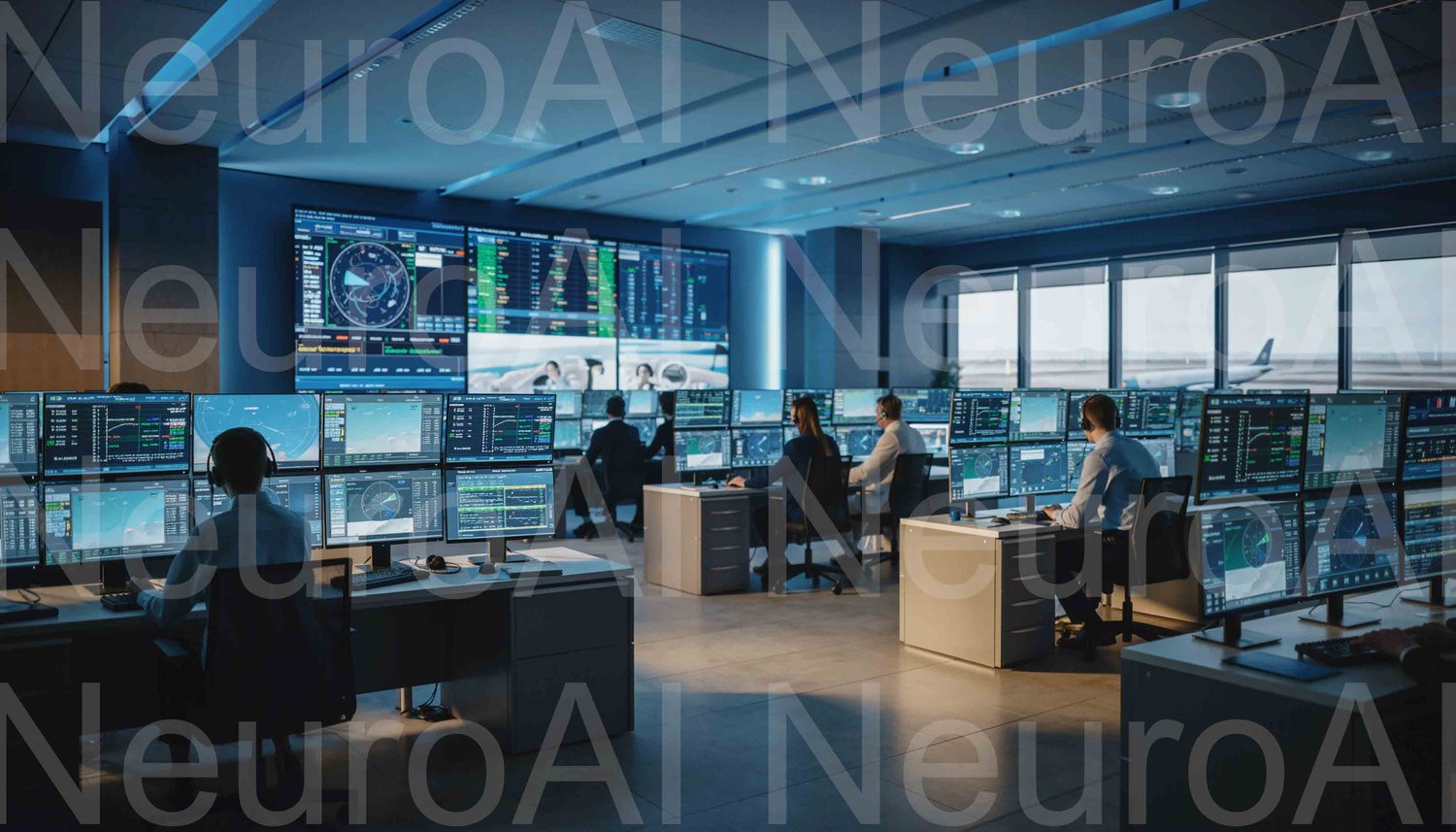 Air traffic controllers monitor flight data displays