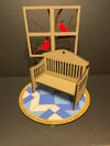 Save a chair w/ Bench is laser cut of wood and hand painted. This set comes with large rug,bench, a window with cardinal, and a Christmas tree. Measures 8.5"X11" and can be purchased painted or blank.