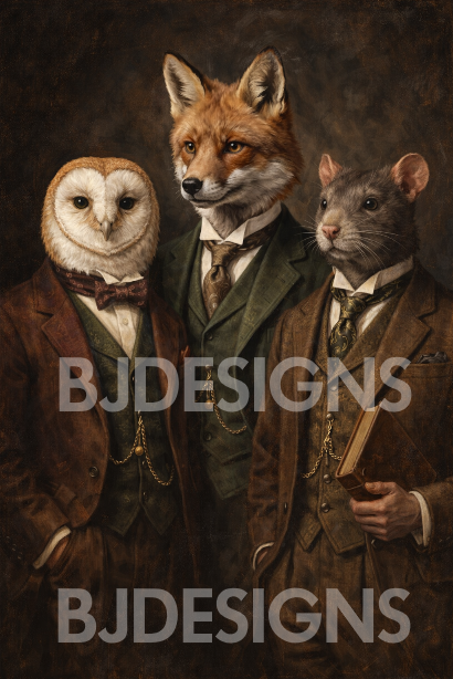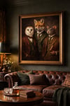 Bring timeless character and charm to your space with this Victorian-style animal portrait, featuring a fox, owl, and rat dressed in elegant 19th-century attire. Inspired by classic oil paintings, this richly detailed artwork blends whimsy, sophistication, and dark academia aesthetics, making it a striking statement piece for any interior.