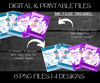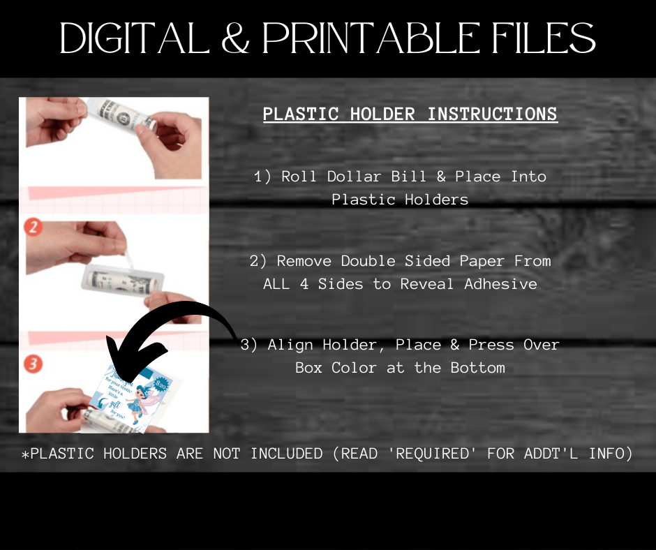 This Trendy $ Holder Cards comes in Zip Files with two PNG Folders. One Folder has Pre-Printed Amounts for Fast Printing. The other Folder has Blanks to write custom amounts. Both Folders has 4 Designs each = 8 PNG Files.