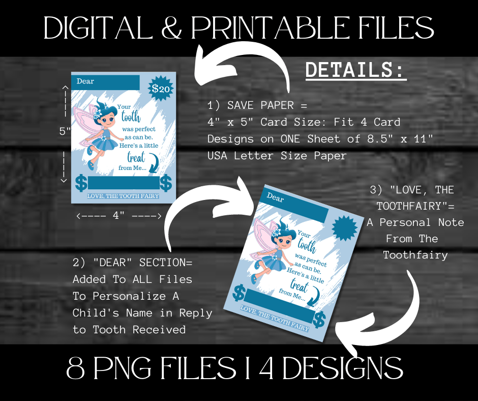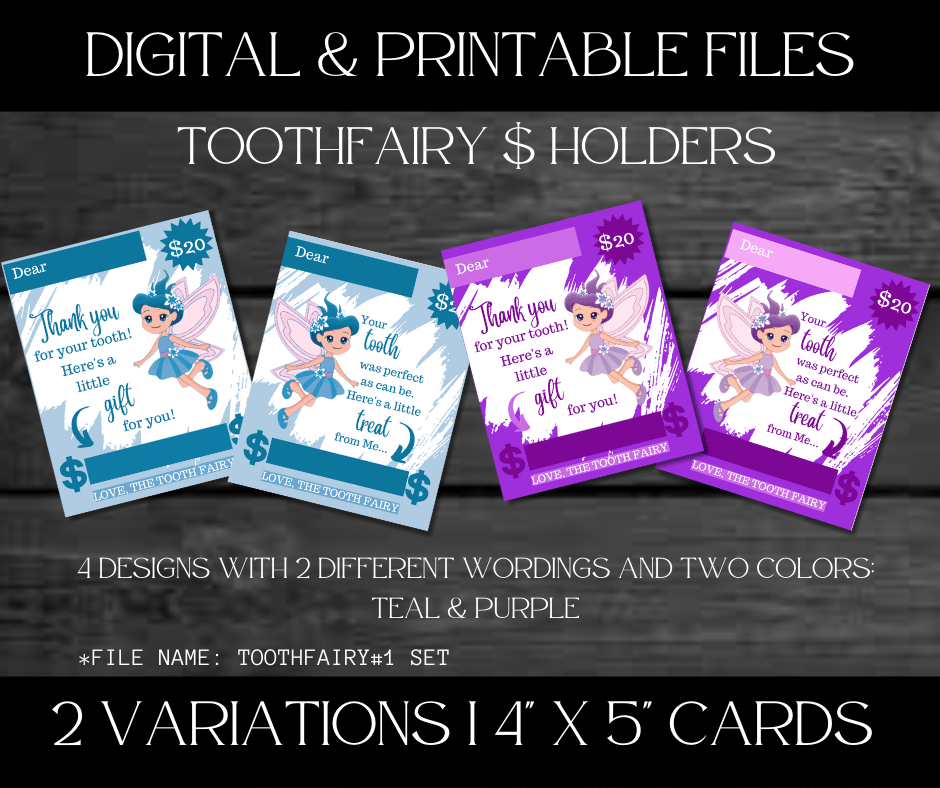 These Toothfairy designs are perfect for children when losing their teeth at a young age, give them a thoughtful gift in exchange of giving up their precious tooth to the toothfairy. These cards comes in handy whenever your child lose their 1st, 2nd or 3rd tooth or more. There are two different wordings along with two different colors that you could swap and change it up during the years. These are just a few of the different --variation of Toothfaiy Sets.