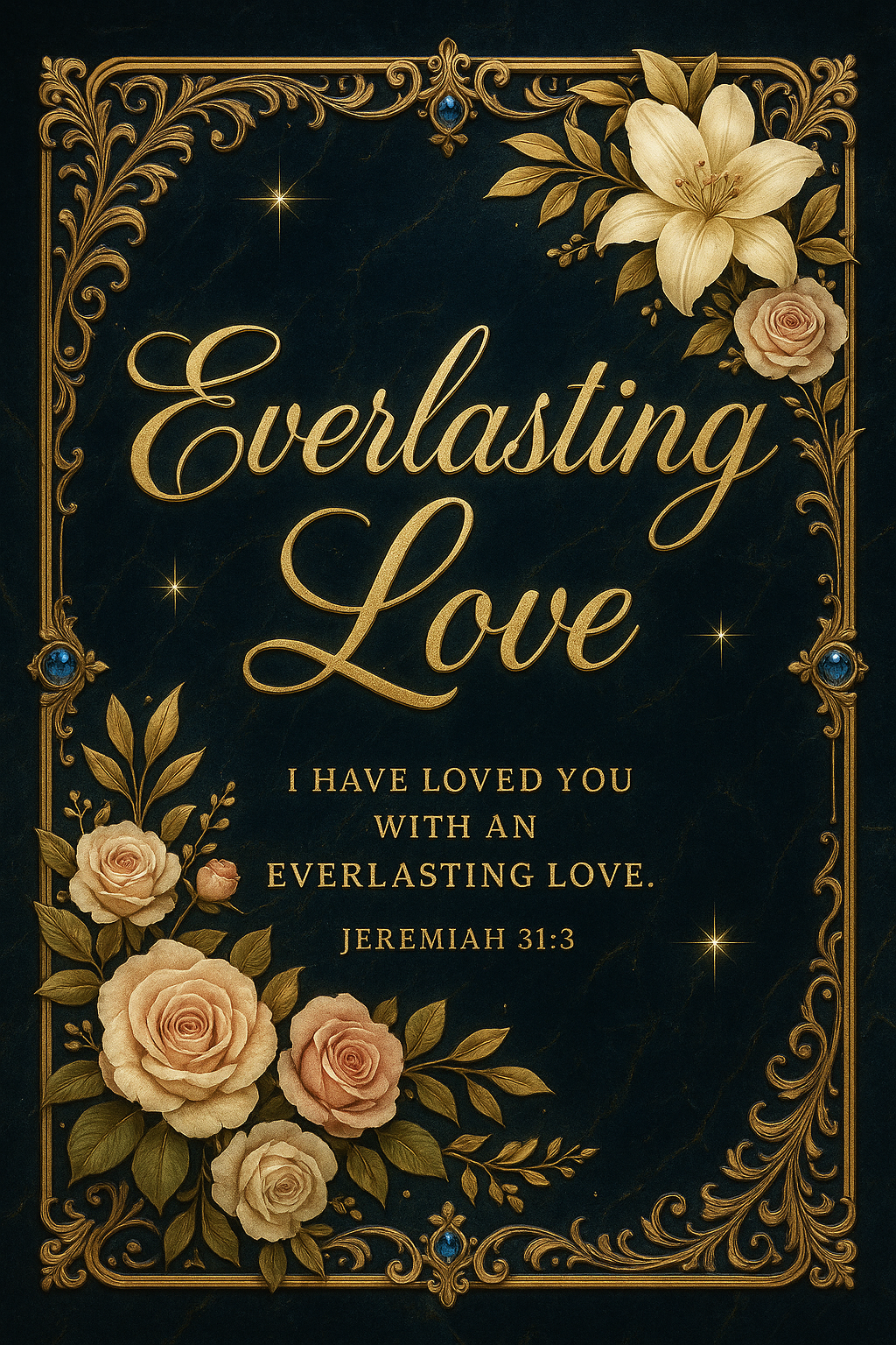 🖤🌟 Christian Everlasting Love Wall Art – Jeremiah 31:3 Floral & Gold Poster – Faith-Based Printable for Wedding, Devotion & Ministry – Eternal Love Theme