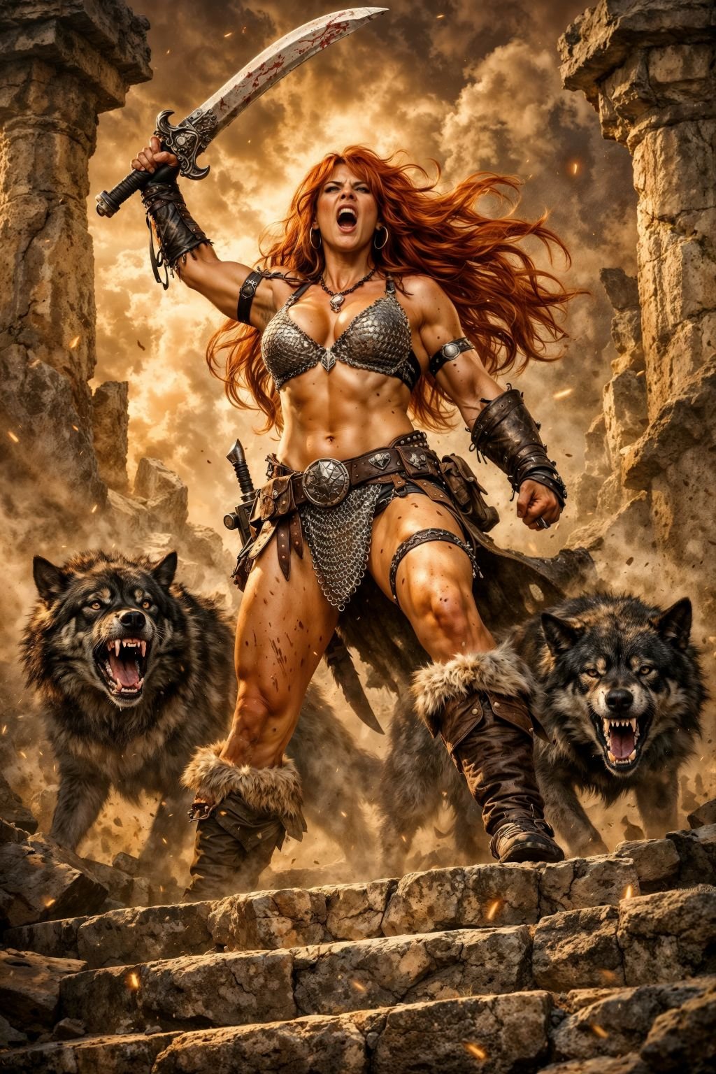 This 10K ultra-high-resolution artwork captures Red Sonja at peak ferocity—blade raised, hair blazing like fire, flanked by two snarling wolves as she claims the broken steps of a fallen world. It’s pure sword-and-sorcery adrenaline: dust, sparks, steel, and savage loyalty—rendered with cinematic 10K clarity that looks incredible at poster and wall-print scale.