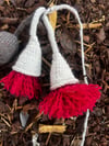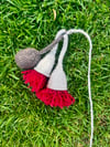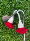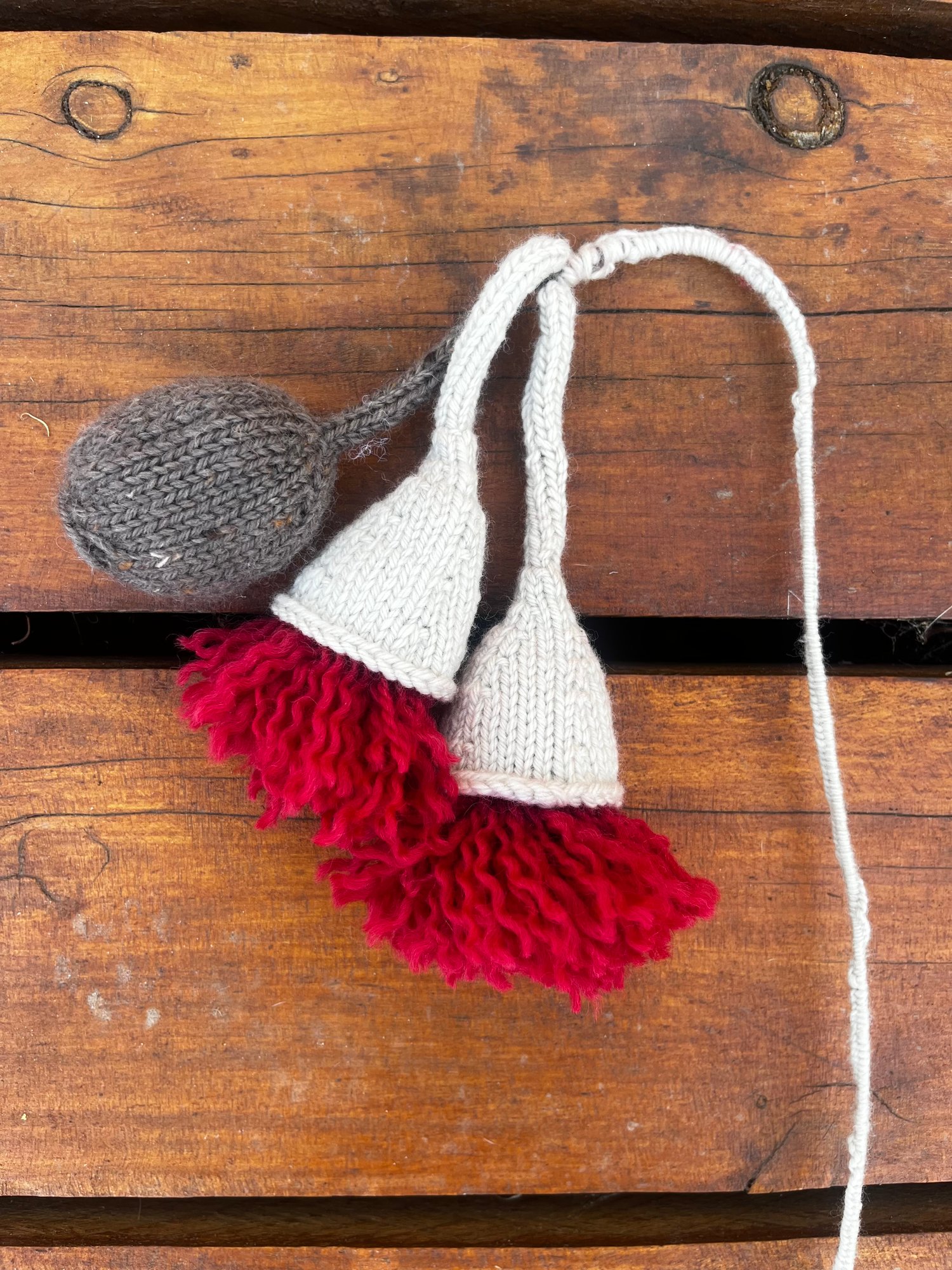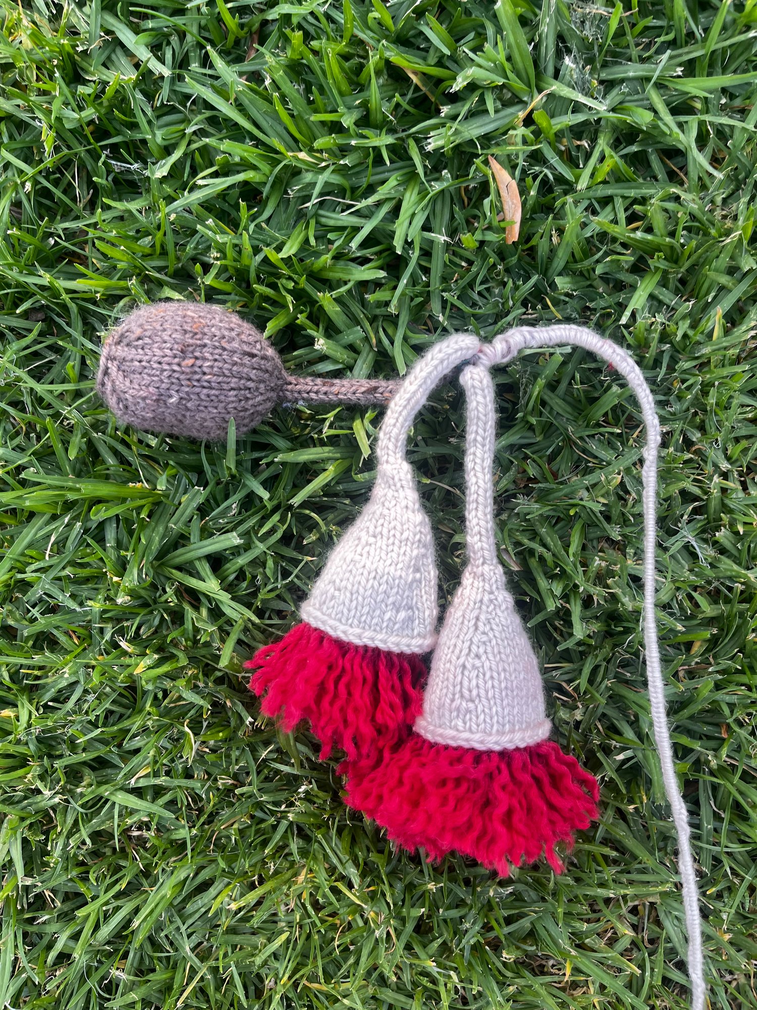 Samples knit in WOOLganic Grapefruit Moon and Gaia with the blossom formed from red yarn found in my leftovers basket.