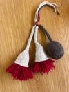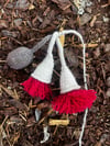 The flower and gum nut both begin with an i-cord. Increases are then used the shape both pieces, with the knitting continuing in the round. The flower head itself is created similar to a pompom. Hitch knots are used on floristry wire to create the branch.