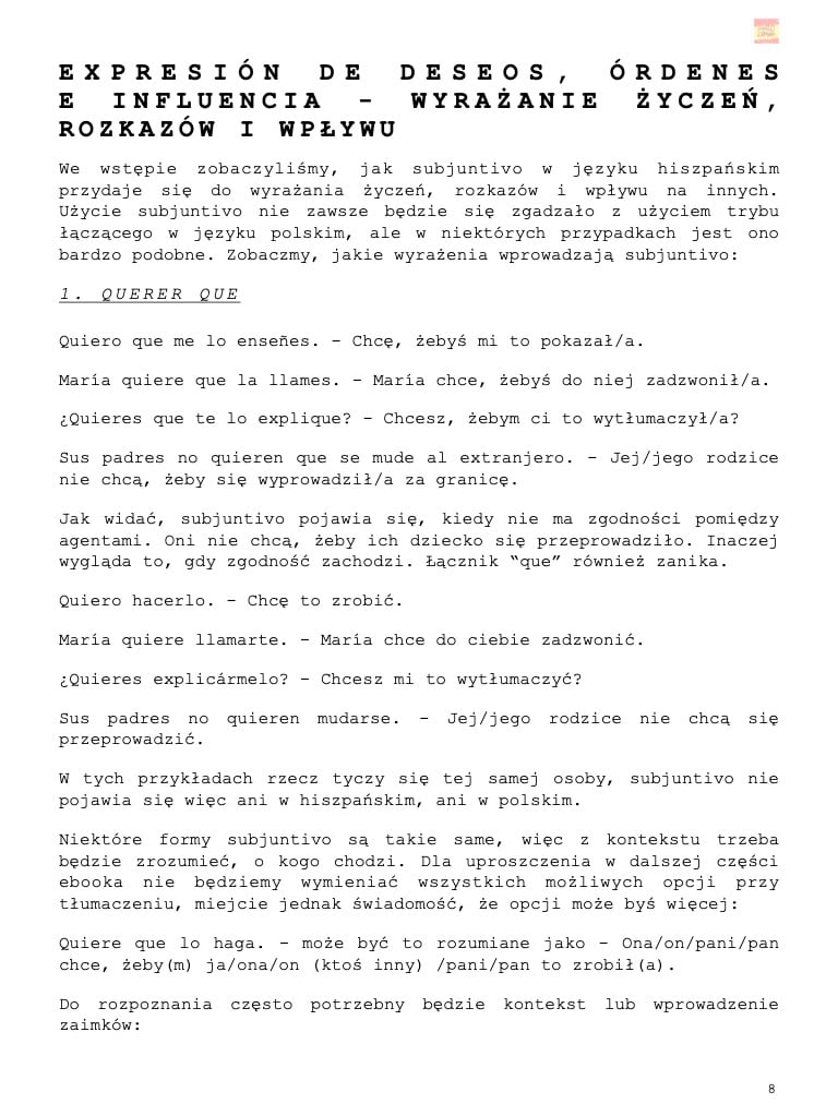 Subjuntivo para Todos - Subjuntivo Presente to pierwszy, jak na razie, ebook traktujący o subjuntivo mojego autorstwa. Powstał on w kooperacji z moim hiszpańskim przyjacielem, Hugonem. Mnie znacie z kanału Hablo Español na YouTube, o Hugonie parę razy wspominałem, ale myślę, że warto go tutaj przedstawić. Poznaliśmy się wiele (jak wiele!) lat temu podczas mojej pierwszej erasmusowej wymiany, mieliśmy wtedy okazję uczęszczać na kilka przedmiotów filologii klasycznej na Universidad de Sevilla. Tak rozpoczęła się nasza wieloletnia przyjaźń a później współpraca. Jak wiecie, ja stworzyłem kanał, Hugo zaś, między innymi, uczy Hiszpanów hiszpańskiego, przygotowując ich do egzaminów wstępnych na studia oraz współpracuje ze mną, prowadząc uczniów online przez tereny nauki kastylijskiej mowy. Ten ebook jest owocem naszej wielotygodniowej pracy i mamy nadzieję, że Wam się on spodoba. W tej części zajmiemy się trybem subjuntivo w czasie teraźniejszym, ale tak kompleksowo, jak nigdzie. Czeka na Was 14 rozdziałów z teorią i ćwiczeniami! Będziecie mogli poznać rozmaite zastosowania subjuntivo w języku hiszpańskim (na poziomie czasu teraźniejszego), przy czym zahaczymy o naprawdę różnorakie rodzaje zdań. Ja zająłem się częścią teoretyczną, w której na przykładach opisuję i wyjaśniam, w jakich kontekstach i sytuacjach możemy użyć danej formy. Hugo zaś zajął się przede wszystkim ćwiczeniami, żebyście mogli sobie to wszystko utrwalić. Polecamy Wam ten ebook bardzo serdecznie i mamy nadzieję, że będziecie się dzięki niemu bawić tak dobrze, jak my, pisząc go! Przewijając w bok, zobaczycie, oprócz spisu treści, przykładową stronę teorii i przykładowe ćwiczenie.