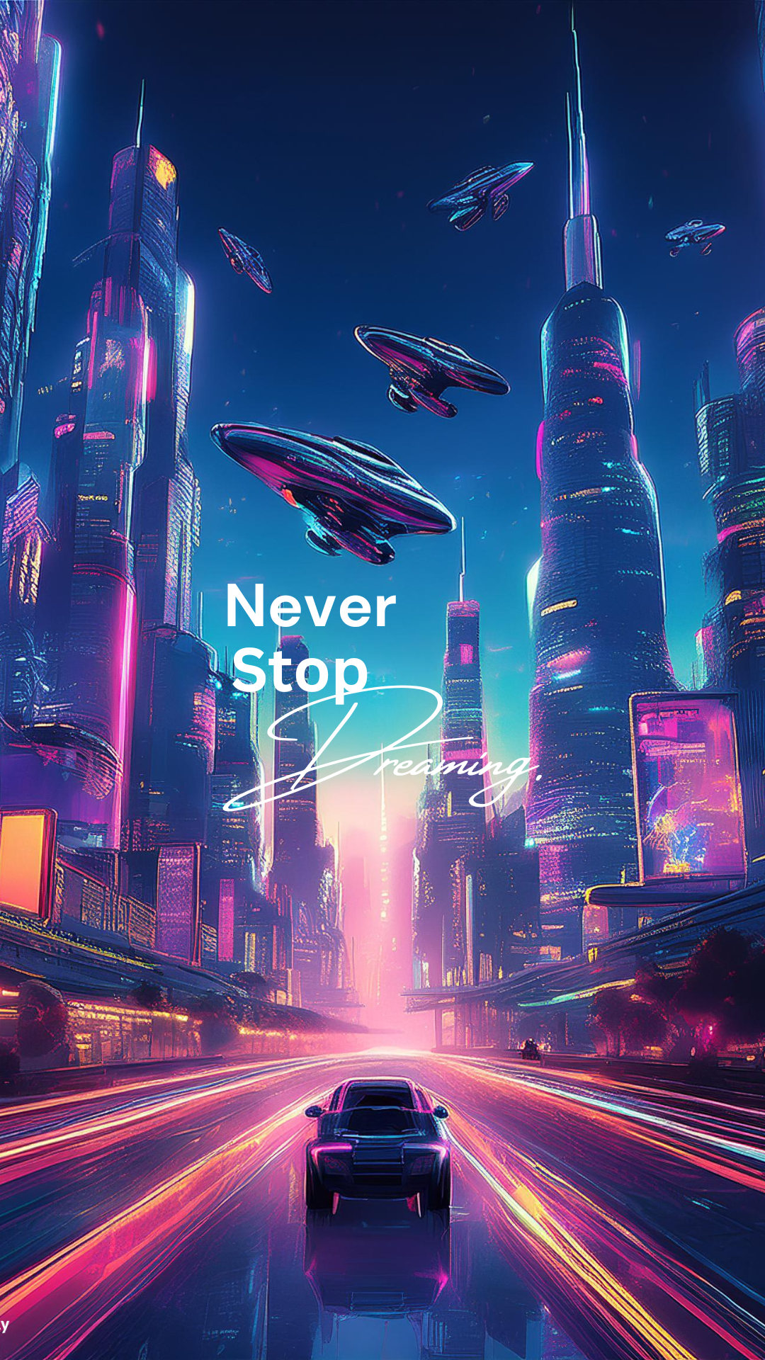 The image features a futuristic, cyberpunk-inspired cityscape illuminated by vibrant neon lights in shades of pink, blue, and purple. Tall, sleek skyscrapers dominate the skyline, with flying cars hovering above the city, adding to the high-tech, sci-fi atmosphere. In the foreground, a modern car speeds down a glowing, neon-lit highway, leaving bright trails behind it. The words "Never Stop Dreaming" are prominently displayed in white, artistic font in the middle of the image, inspiring a sense of ambition and limitless possibilities. The overall aesthetic of the scene is sleek, energetic, and forward-looking, blending a sense of wonder and urban futurism. Perfect for anyone looking for a motivating, cyberpunk wallpaper for their device.