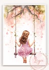 Printable Pink Girl on a Swing Print Nursery Decor, Girl Floral Nursery Poster, Wall sign, Nursery Art