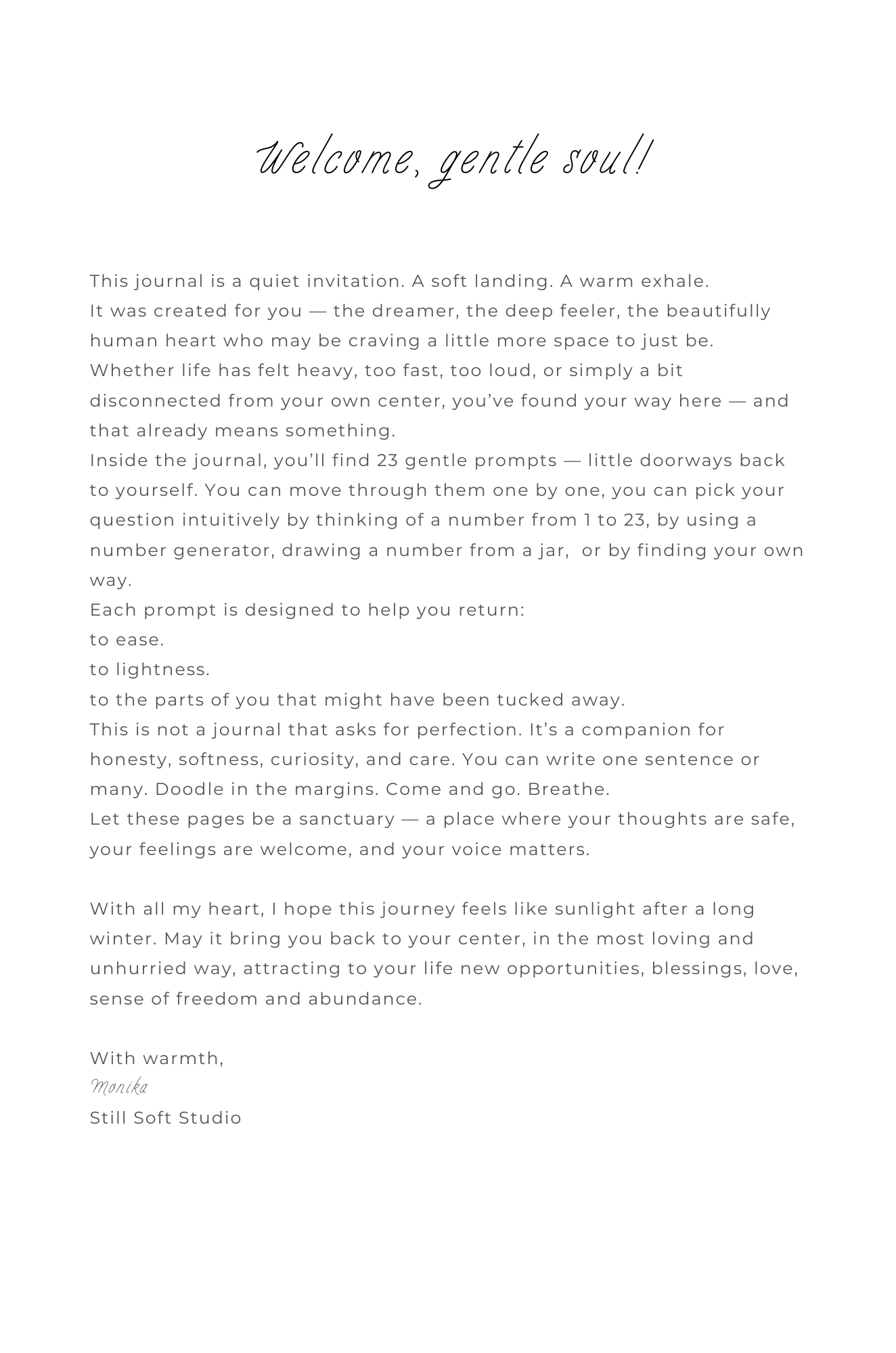 The journal consists of 122 pages, including inspiring quotes, blank pages with a little drawing at the left corner and section to write the date, weekly check-ins and 23 soulful prompts listed at the very beginning, designed to be a guiding compass for you in your journey of inner connection. Each page invites reflection, clarity, and ease. Whether you're in need of rest, seeking a fresh perspective, or simply craving a quiet moment to listen inward, this journal meets you with warmth and openness.