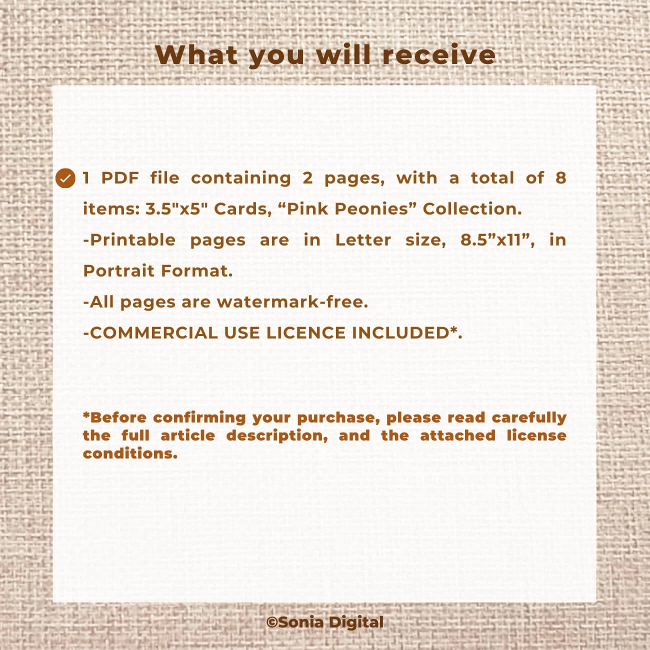 🔸2 printable pages containing 3.5”x5” Cards (with a total of 8 items) “Pink Peonies” Collection. Printable pages are Letter size (8.5”x11”). All pages are sold watermark-free. Commercial use license included*.