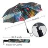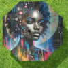 The umbrella features a futuristic design with the face of a Black woman at its center, her hair depicted as a cosmic afro filled with vibrant colors and digital patterns. The background blends deep blues and bright accents, merging themes of Afrofuturism, technology, and cosmic exploration, making this a striking and innovative statement piece.
