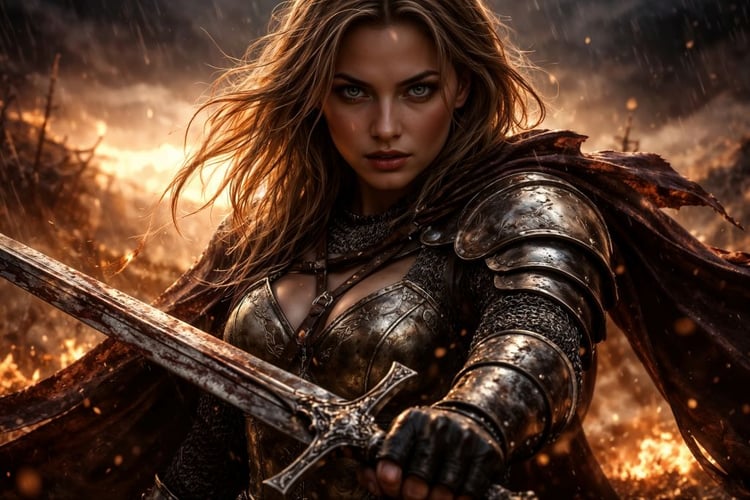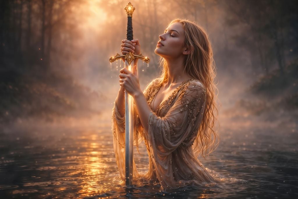 This true 10K medieval fantasy artwork captures a breathtaking, mythic moment: a serene maiden standing in still water at dawn, hands wrapped around a radiant, gilded sword as mist and golden light swirl like a blessing. The scene feels like the birth of an oath—quiet power, holy atmosphere, and the sense that the blade chooses her, not the other way around.