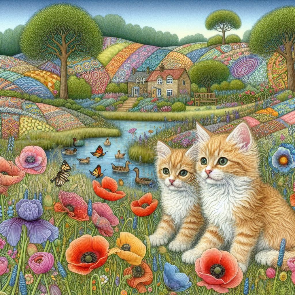 Ginger & white cats in a field of flowers, little cottages, a pond, ducks & butterflies.