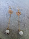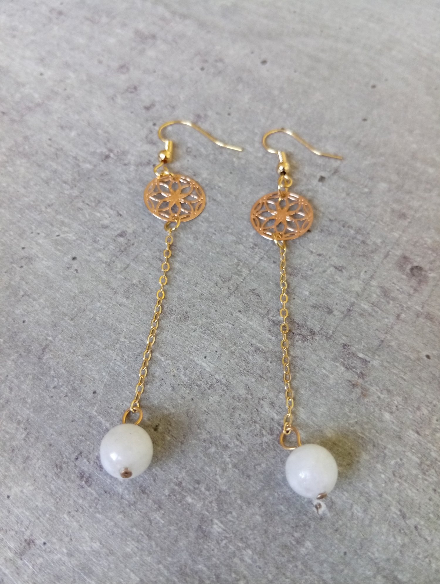 Boucles d’oreilles pendantes alliant la finesse d’une chaîne dorée à la douceur nacrée de la pierre de lune. Ornées d’un délicat motif Fleur de Vie ajouré, elles diffusent une énergie d’harmonie et de connexion intuitive, tout en restant élégantes et légères.