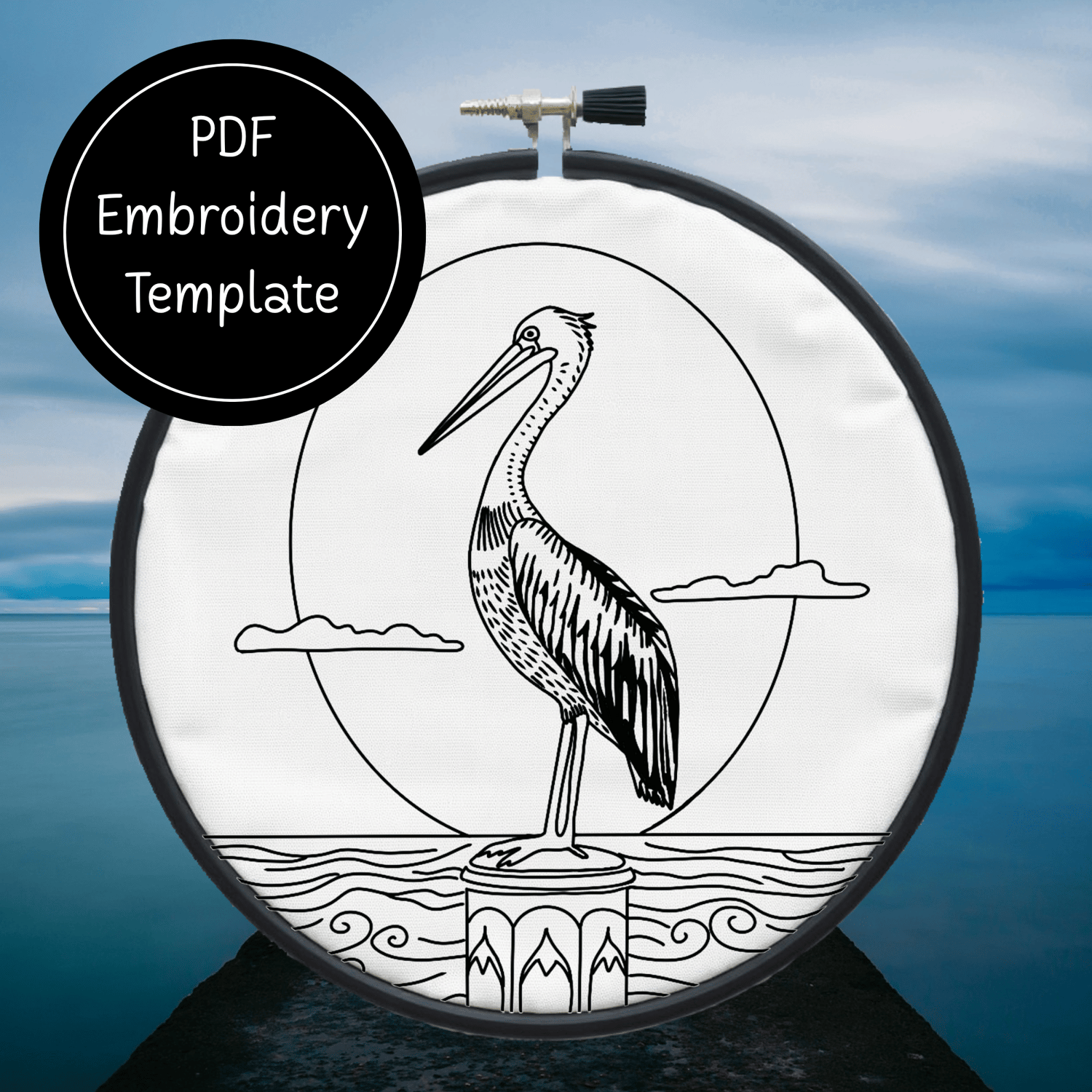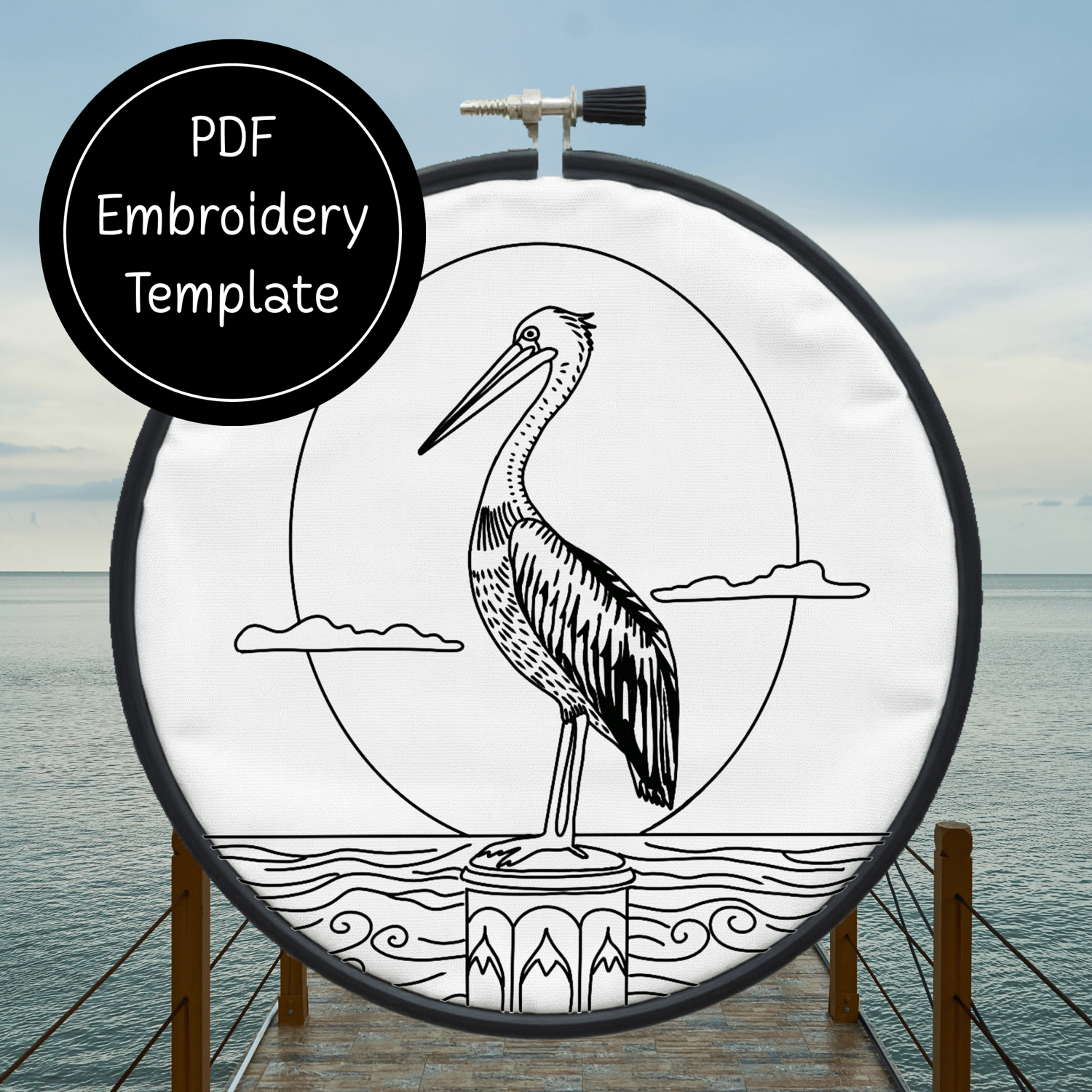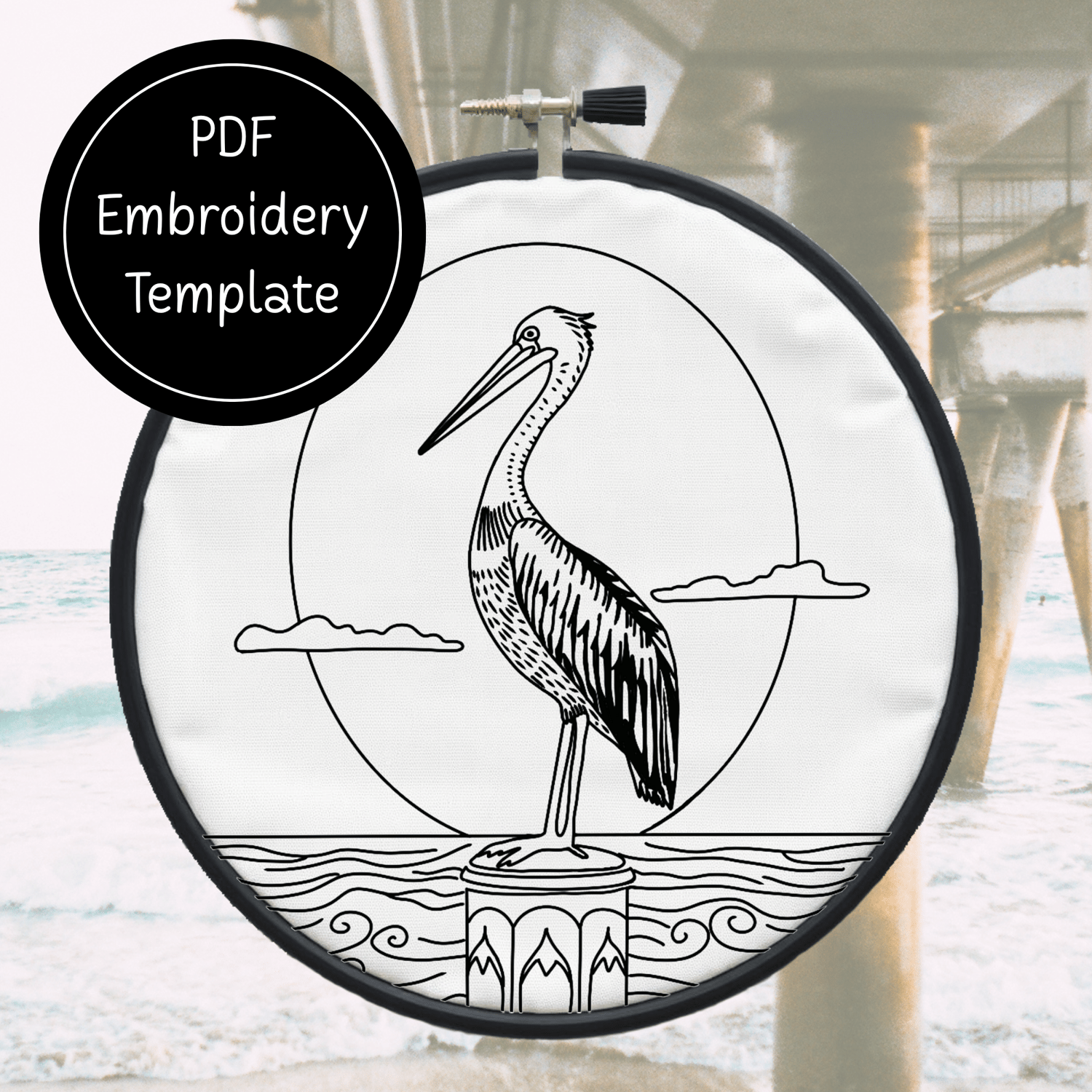Pelican On Pier Embroidery Template PDF - DIY Bird Design For Hand Stitching - Instant Download