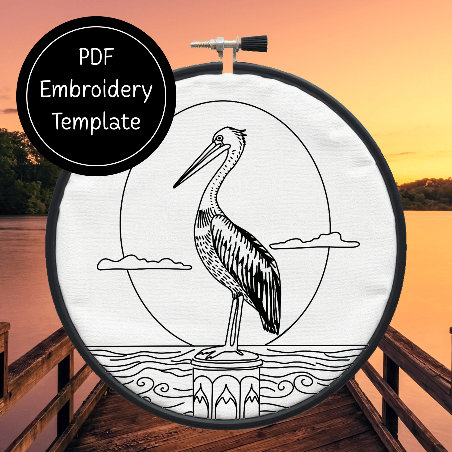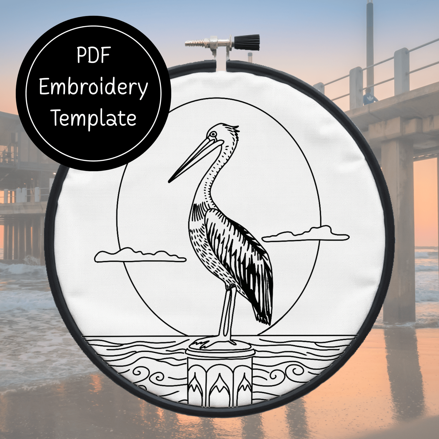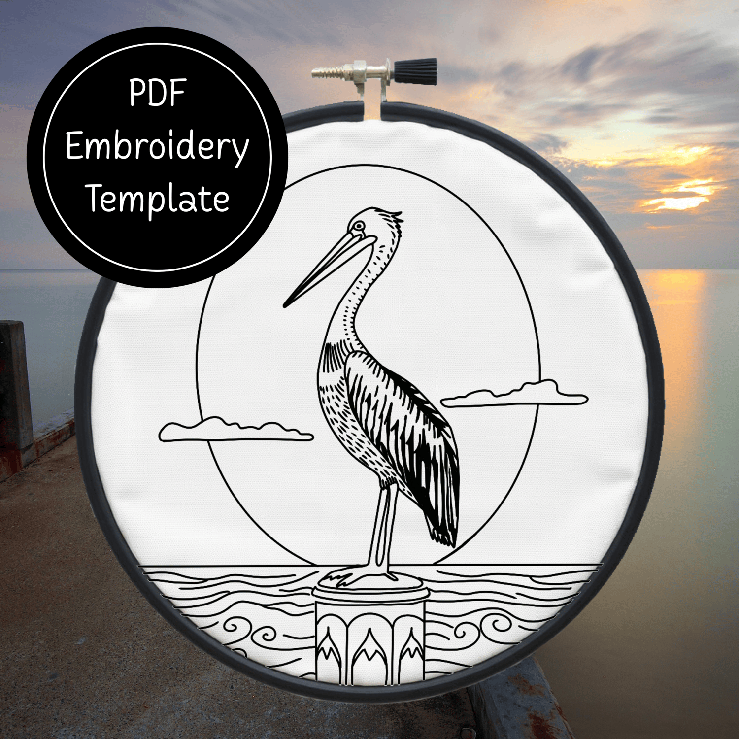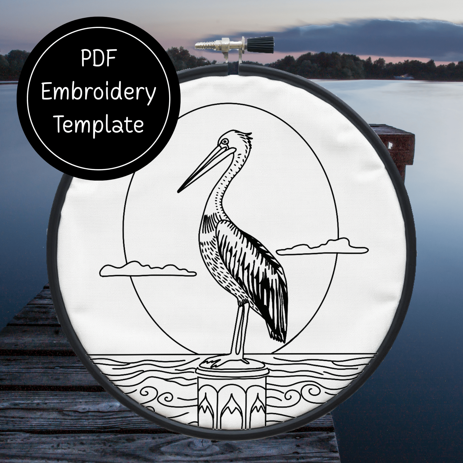 Pelican On Pier Embroidery Template PDF - DIY Bird Design For Hand Stitching - Instant Download