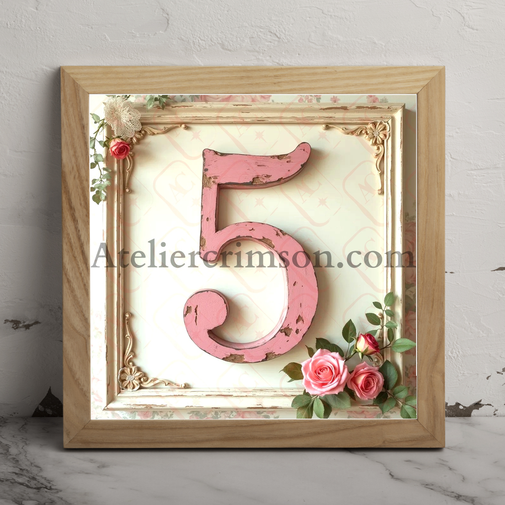 Number 5 pink and shabby chic This charming series presents the alphabet reimagined in a delightful shabby chic style. Each letter is crafted from weathered pink wood, standing proudly against a soft cream background. The collection exudes a romantic, vintage atmosphere with its elegant typography and subtle decorative elements.