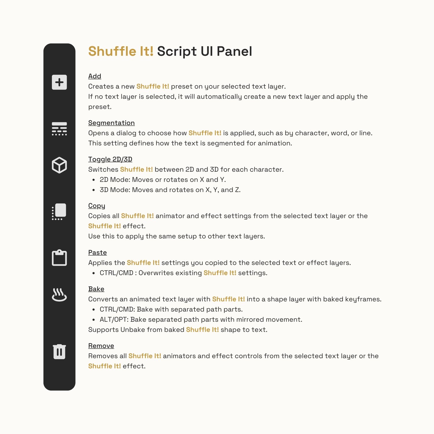 1. Add - Adds Shuffle It! preset (creates text layer if none selected)