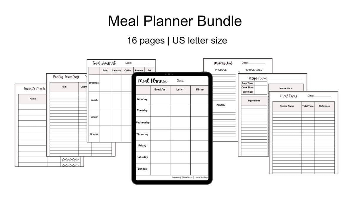 - Pages for: meal ideas, recipes, food journal, favorite meals, body measurements, and weight tracker