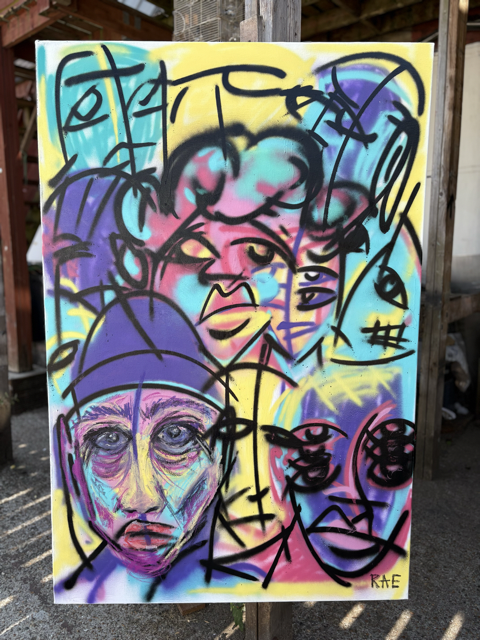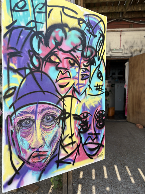 Painted onto a canvas that I found in the warehouses that also tells it own story with some scuffs and tears along the edges, and a previous painting from an unknown artist hidden beneath the layers of my own.