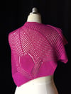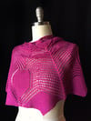 A huge crest and three large horns made Triceratops one of the most recognizable dinosaurs. So too is this shawl distinctive with its six-pointed silhouette and stockinette horns on an expanding mesh background.
