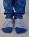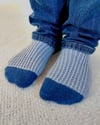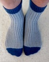 My husbands sock is the Large size worn with the recommended 1” negative ease. Knit in West Yorkshire Spinners Signature 4ply Solids, the main colourway is ‘129 Dusty Miller’ and the contrast colour is ‘157 Juniper’.