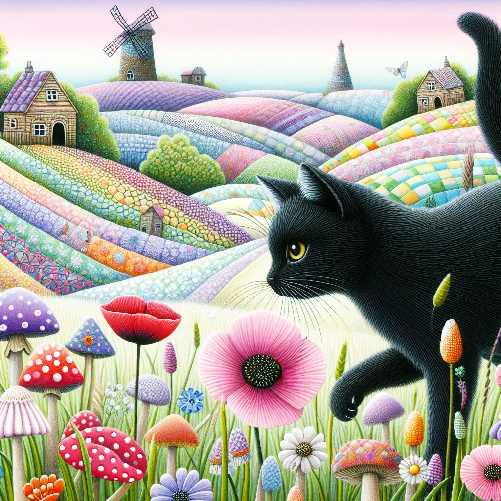 Playful Black cat & high patterned hills with poppies, daisies, & toadstools. There are small houses at the top of hills & a windmill made of colourful mosaics.