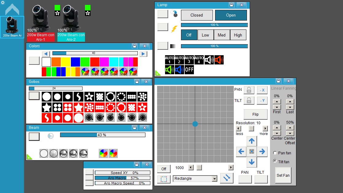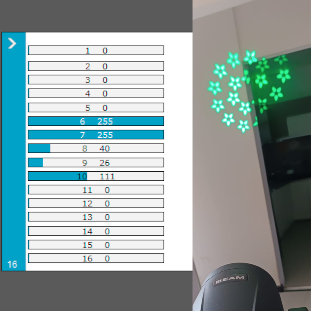 * En el modo de 15CH Verifique, con un Fixture de pruebas (click), que coincidan estos canales: 6 Dimmer, 7 Strobo/Shutter, 10 Prisma, 8 en el valor 40 = Color Verde, 9 en el valor 26 = Gobo de la cuarta foto, 14 Aro Led.